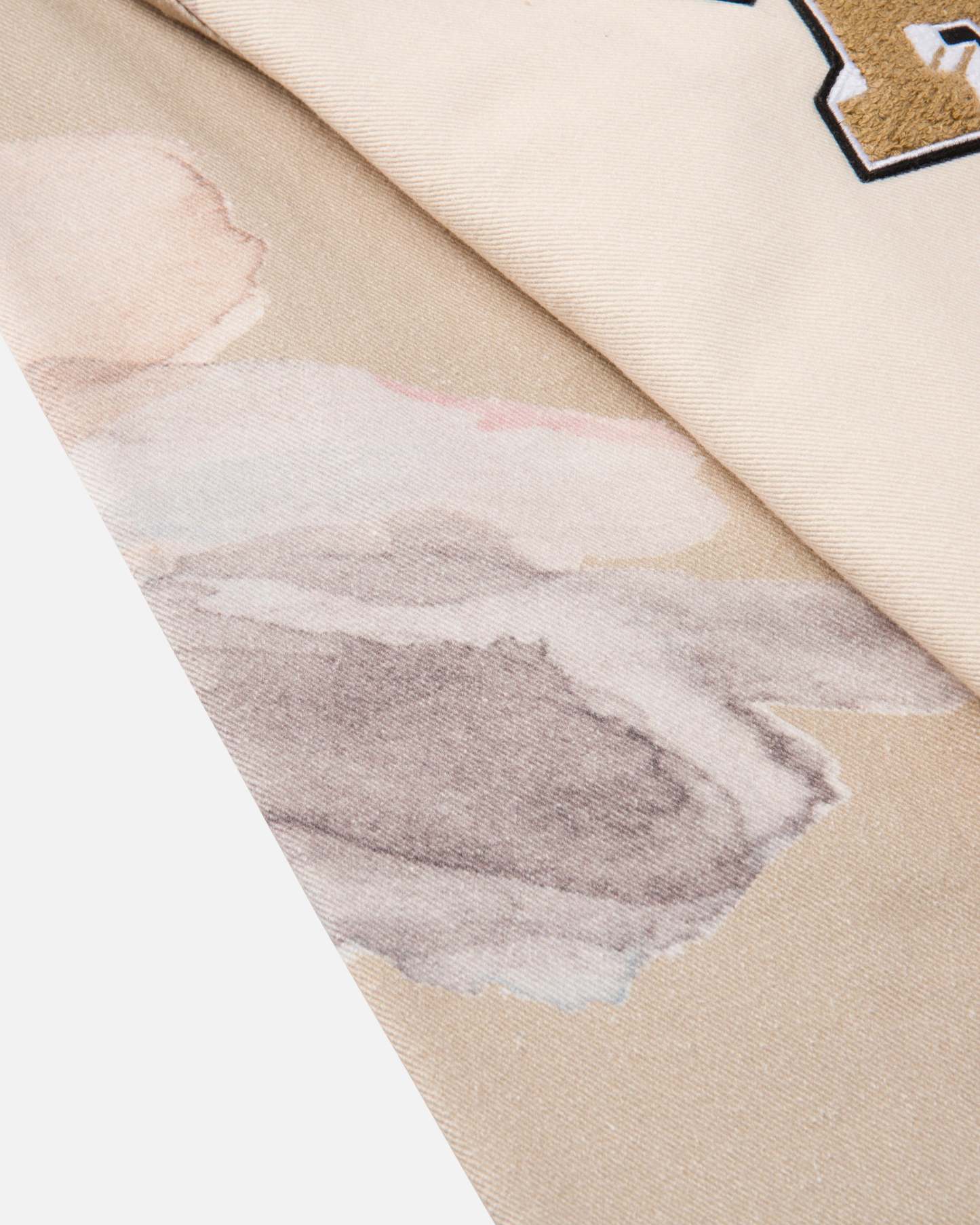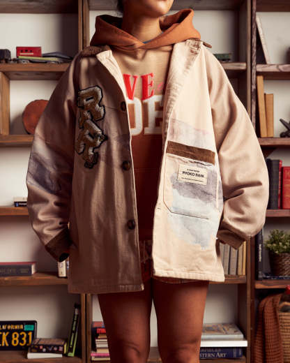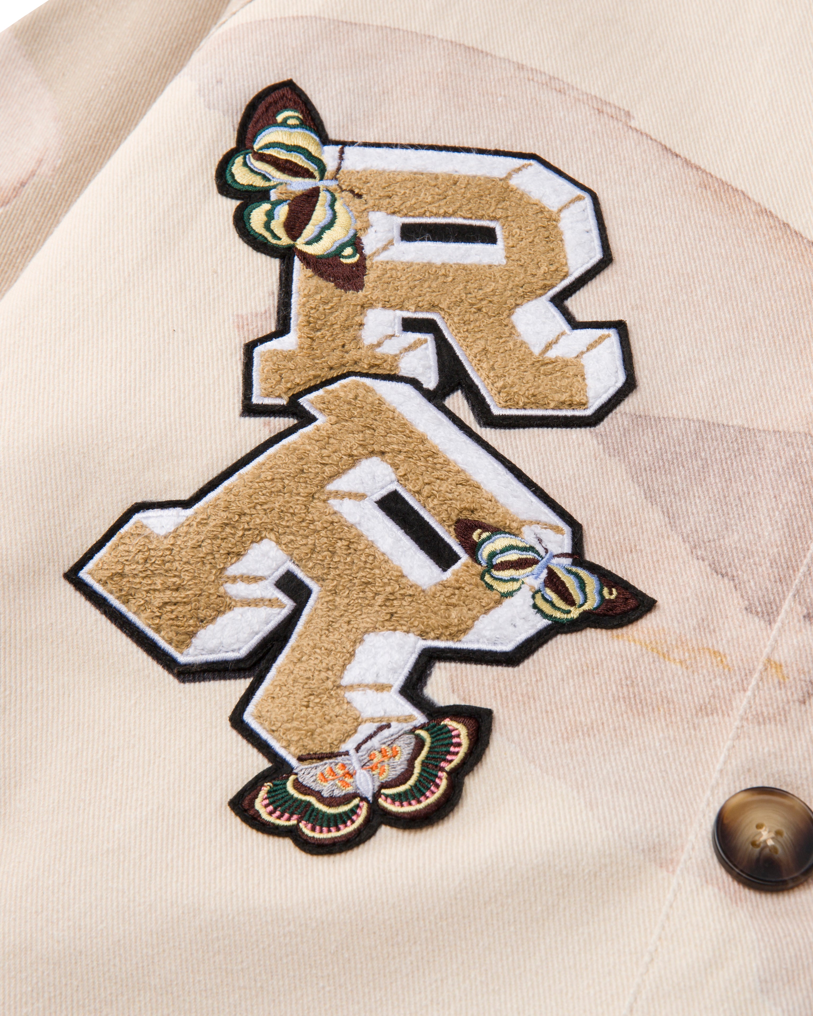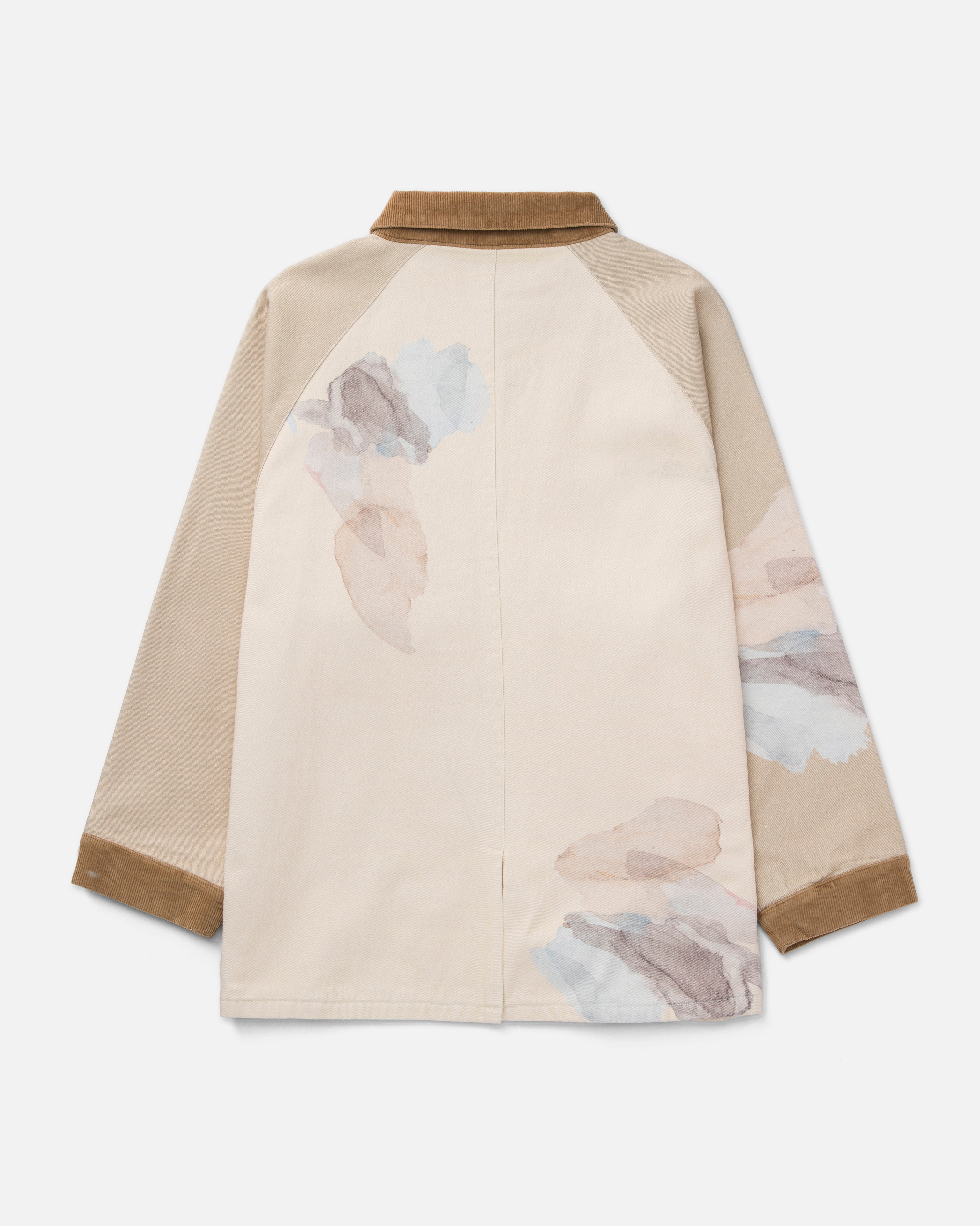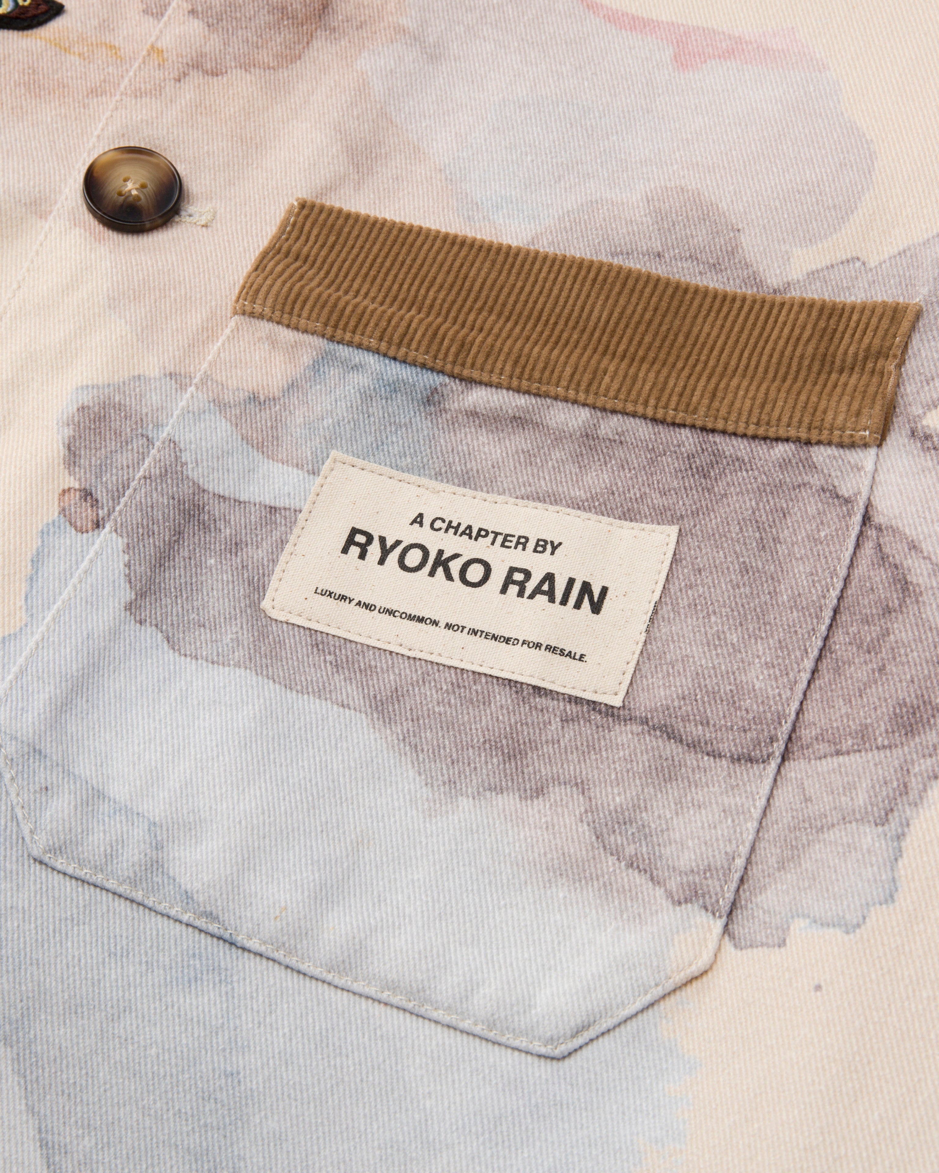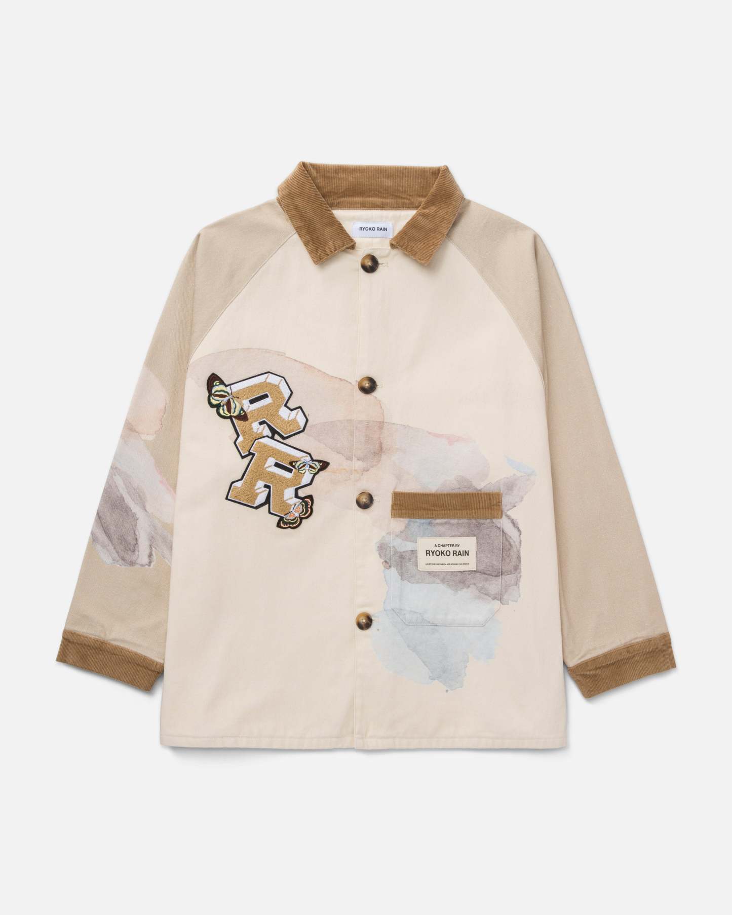 Ryoko Rain chore artist jacket with a neutral toned body and taupe sleeves. Featuring watercolor details throughout the jacket. Right lower chest RR stacked chenille patch with butterfly detailing. Tan corduroy collar and cuffs . Left lower corduroy lined front pocket with new sewn on woven patch.