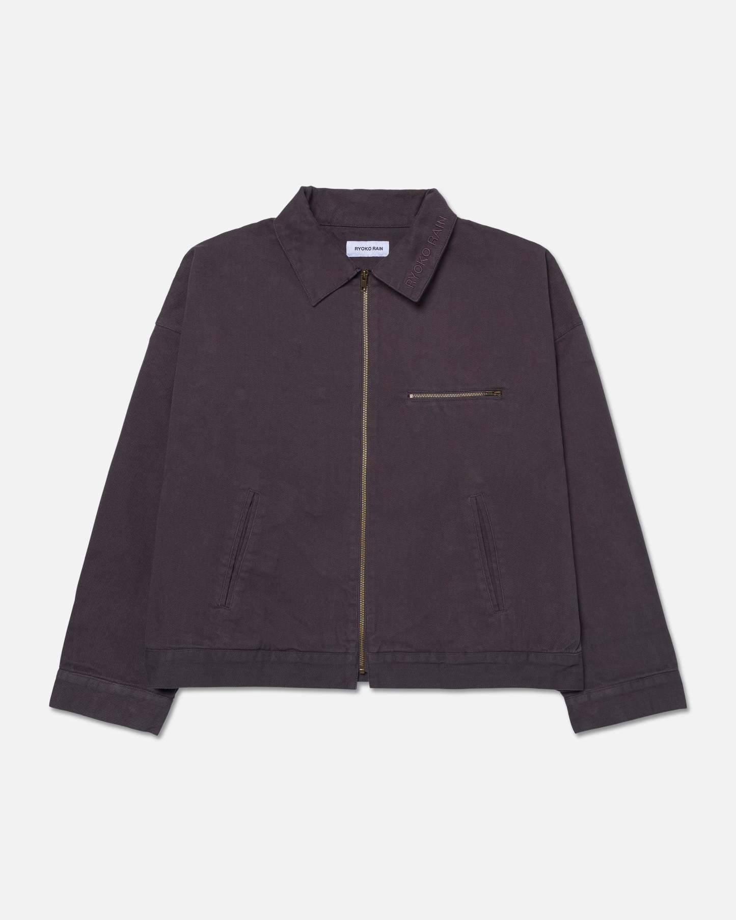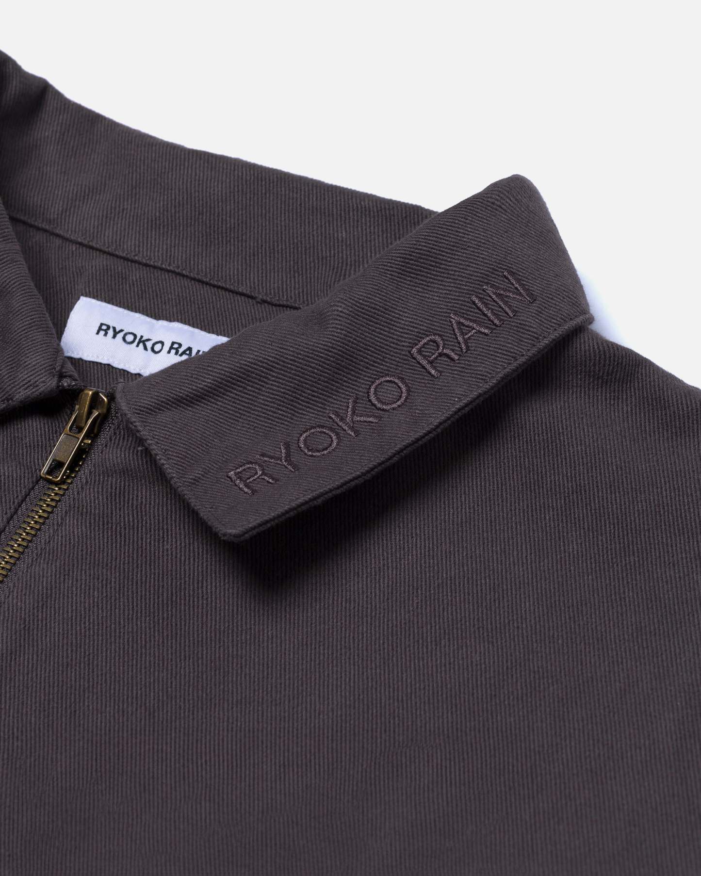 Classic charcoal grey Ryoko Rain work jacket. Featuring an embroidered collar. Brass zippered chest pocket and inner liner pocket.