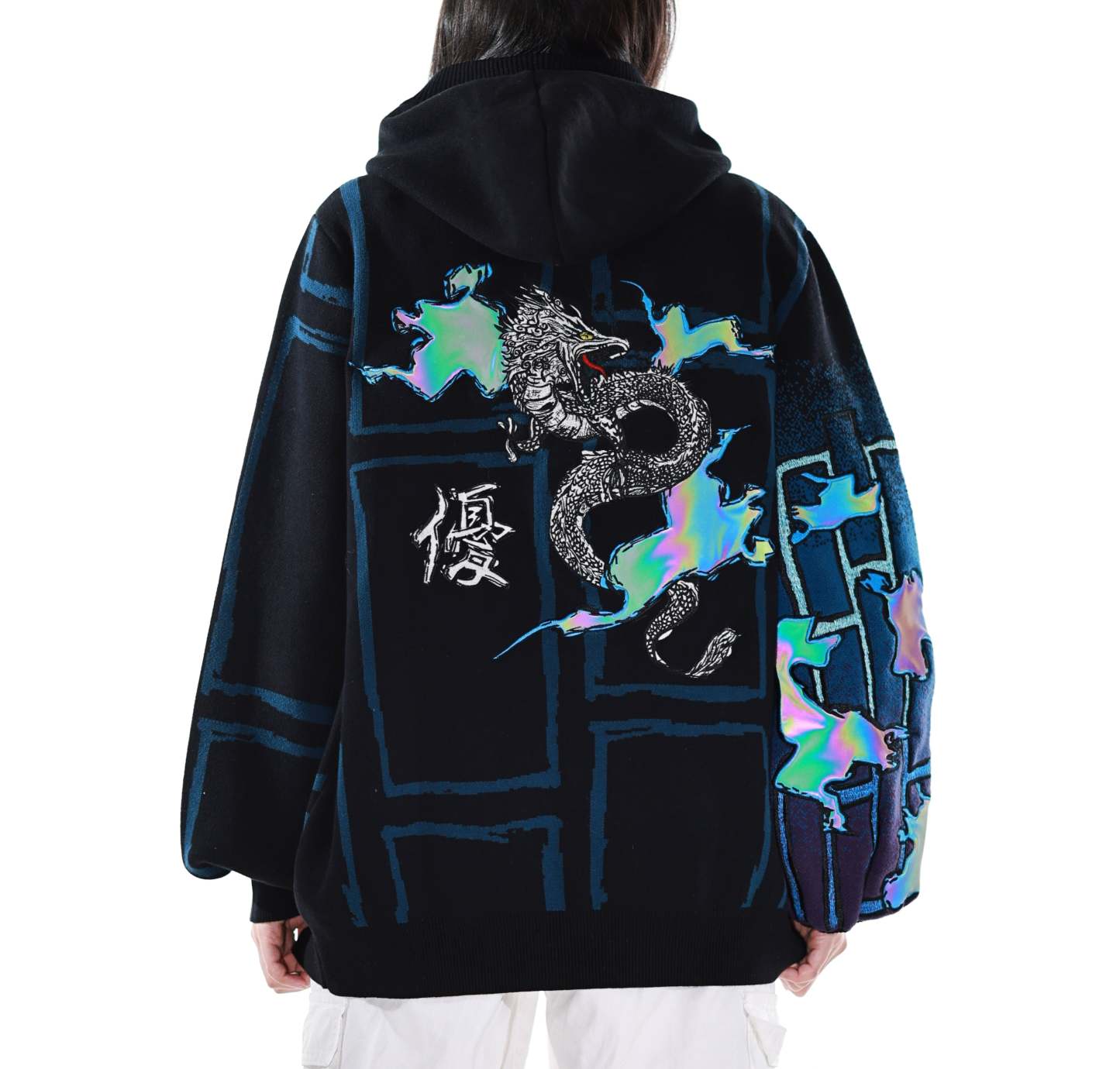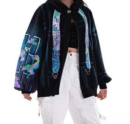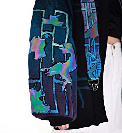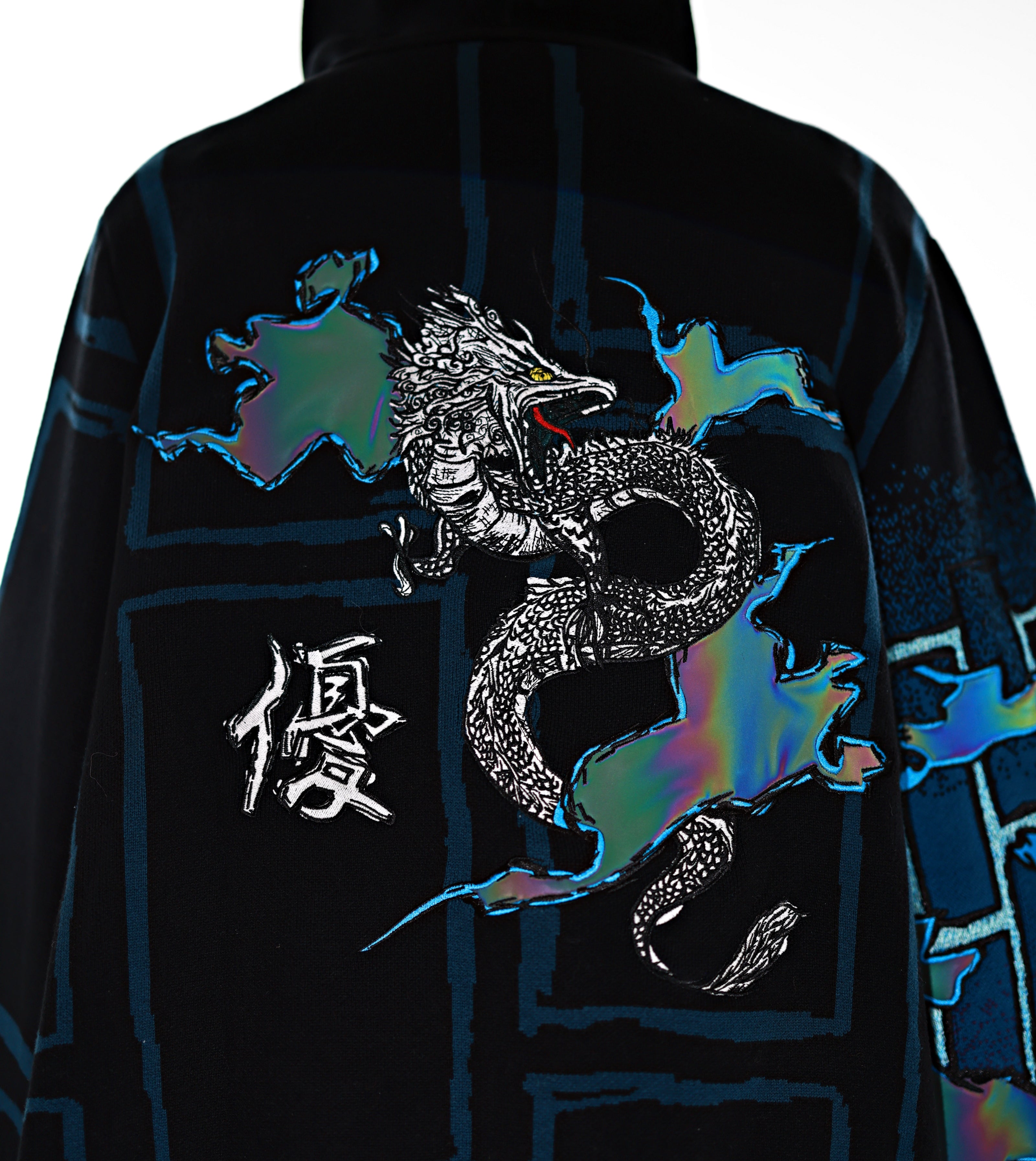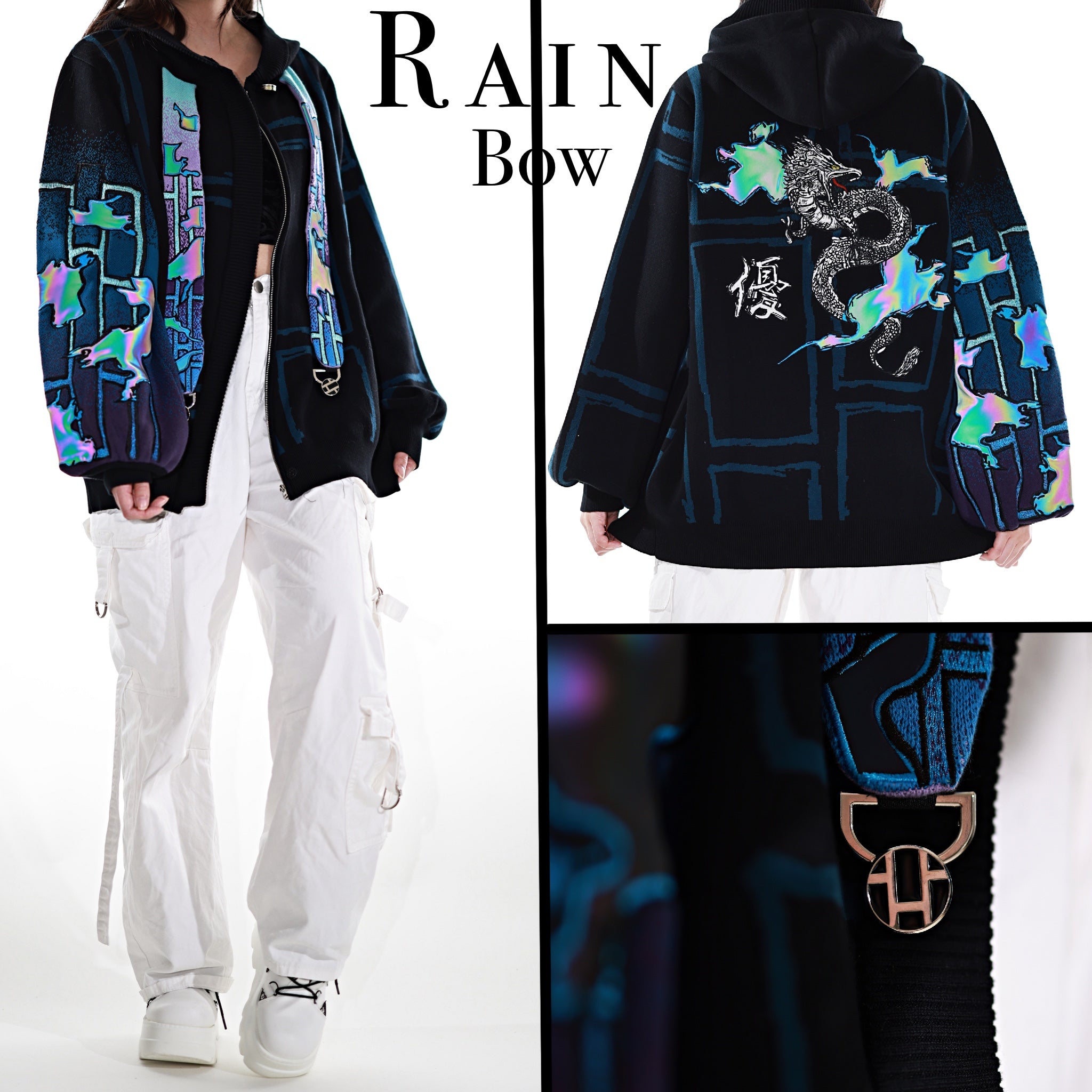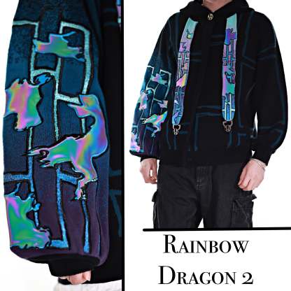This whole collection features some of the most detailed embroidery we have ever made. The rainbow dragon on the back is made from over 100000 stitches and takes over 10 hours to stitch out. The new added holographic appliqué on the sleeve is something no brand has ever done & creates a super unique effect with beautiful colors. The total production time for this design is over 24h & we are working with all factories we have collaborated with so far to make the launch of this design possible! The rainbow material remains more subtle in most lighting situations. The design also features our new magnetic buttons and pendants that let you customize your hoodie and add your own touch! It comes with a set of button top pieces that can easily be interchanged with top pieces from other hoodies from this collection. You will also be able to purchase complementary top pieces as an add on in the future to further customize these hoodies. The pieces are made from high quality metal and black resin. The fabric is made from the highest quality 100% cotton yarns. The design also features a beautiful gradient jacquard patterns on the sleeves and a curved Zipper to give this design an even more unique look.