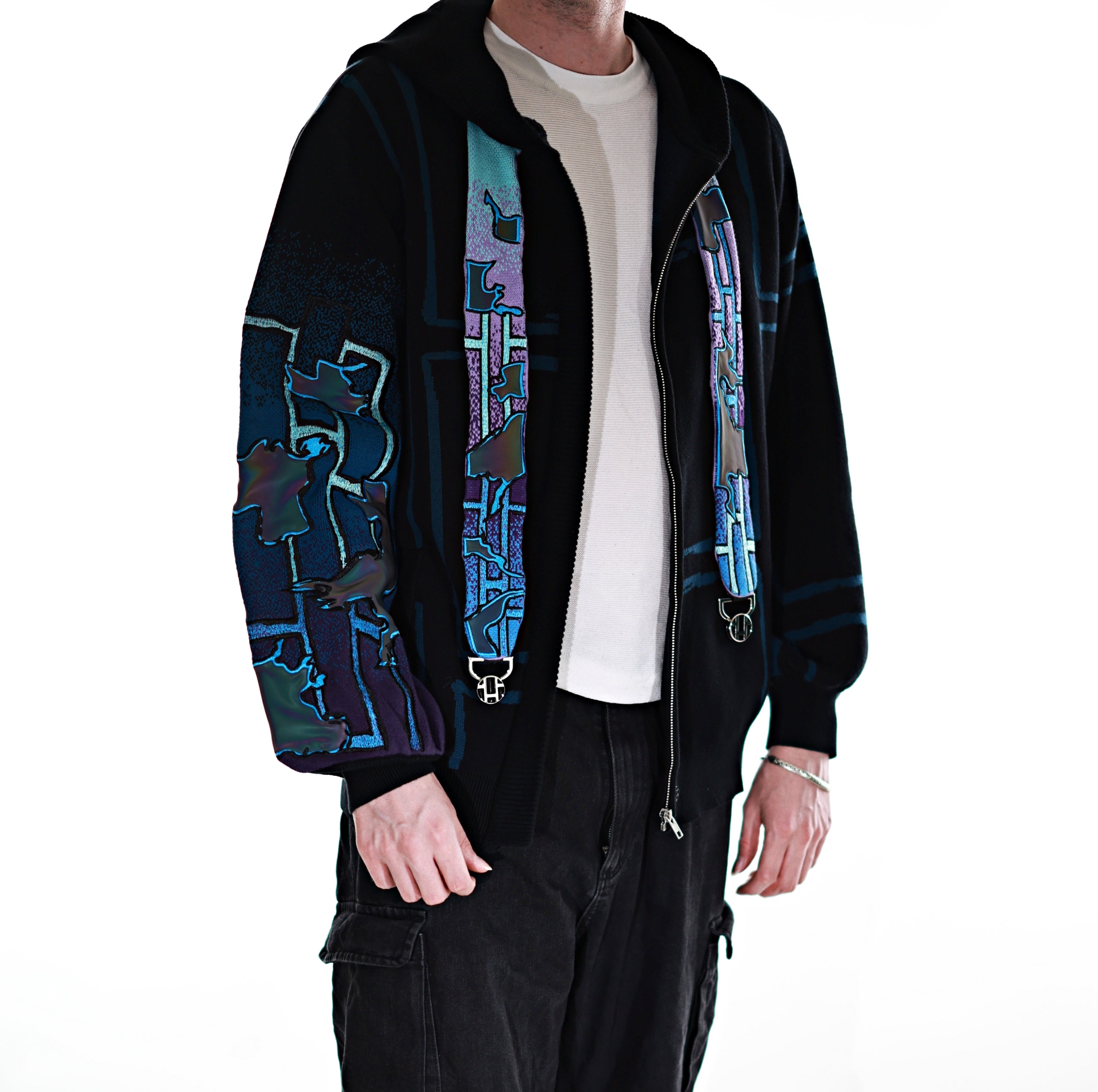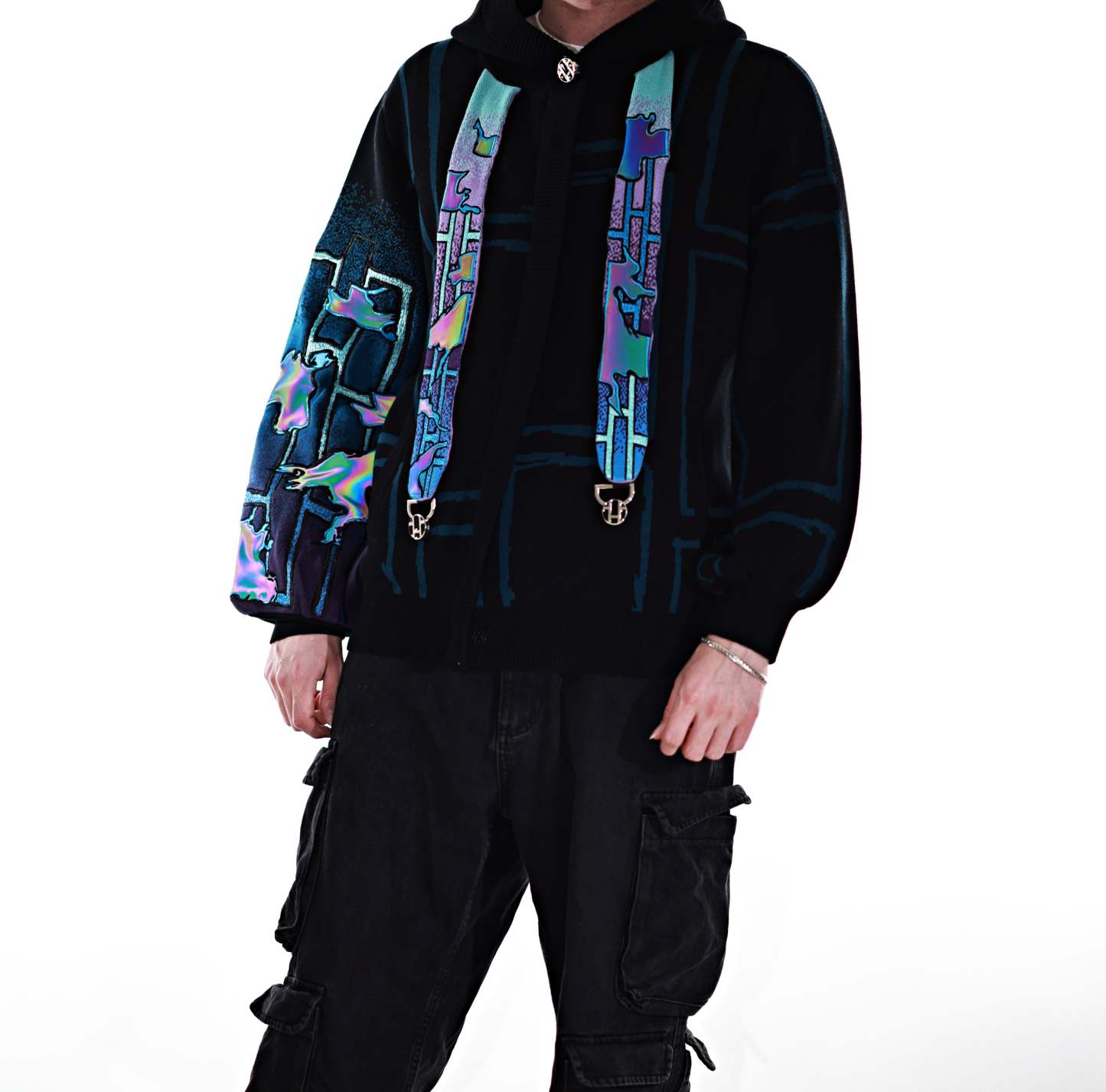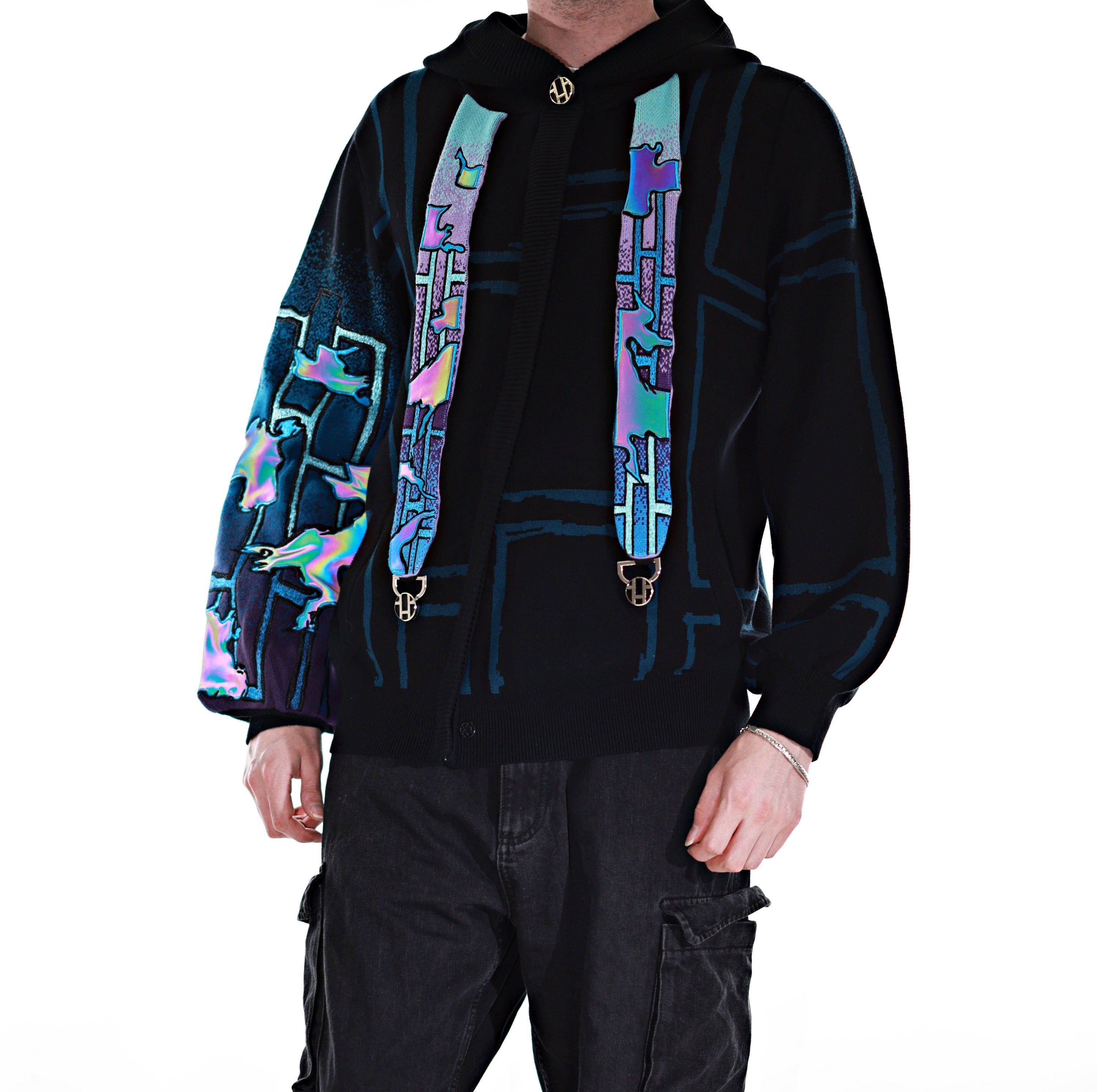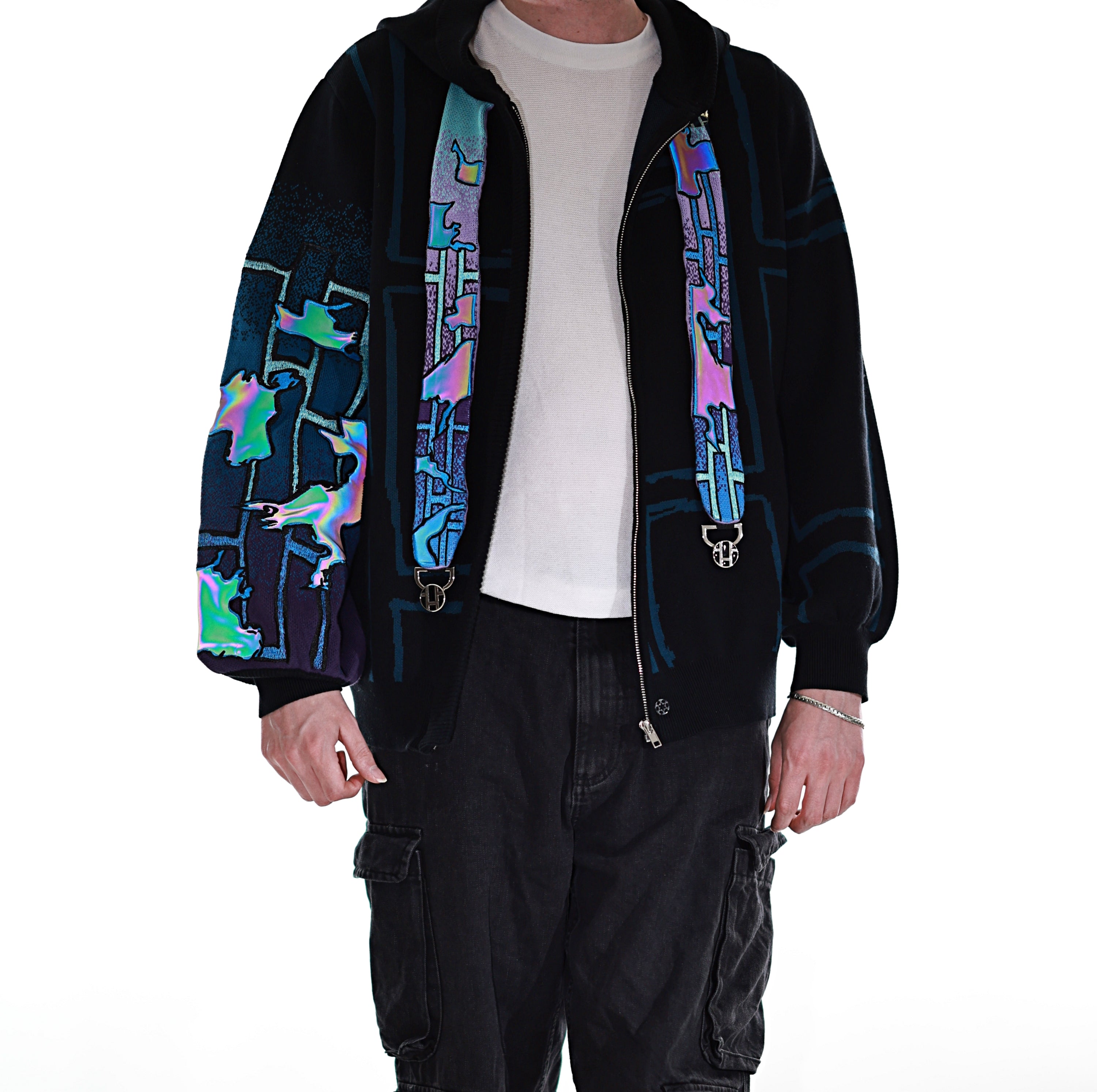 This whole collection features some of the most detailed embroidery we have ever made. The rainbow dragon on the back is made from over 100000 stitches and takes over 10 hours to stitch out. The new added holographic appliqué on the sleeve is something no brand has ever done & creates a super unique effect with beautiful colors. The total production time for this design is over 24h & we are working with all factories we have collaborated with so far to make the launch of this design possible! The rainbow material remains more subtle in most lighting situations. The design also features our new magnetic buttons and pendants that let you customize your hoodie and add your own touch! It comes with a set of button top pieces that can easily be interchanged with top pieces from other hoodies from this collection. You will also be able to purchase complementary top pieces as an add on in the future to further customize these hoodies. The pieces are made from high quality metal and black resin. The fabric is made from the highest quality 100% cotton yarns. The design also features a beautiful gradient jacquard patterns on the sleeves and a curved Zipper to give this design an even more unique look.