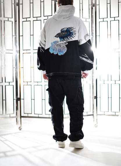 NOTE: To improve the overall look of the back embroidery, the fish will be slightly moved so that the white fish is completely on the black background like in drawings we have shown before.