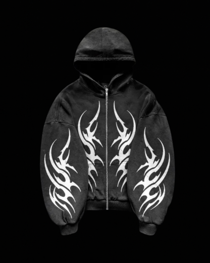 Full-zip hoodie with oversized tribal hits across the chest and sleeves—clean, aggressive, and easy to style. Washed mid-heavy fleece, roomy drop-shoulder fit, ribbed cuffs/hem, and kangaroo pockets for everyday wear. High quality cotton blend, true to size, and ready to ship.