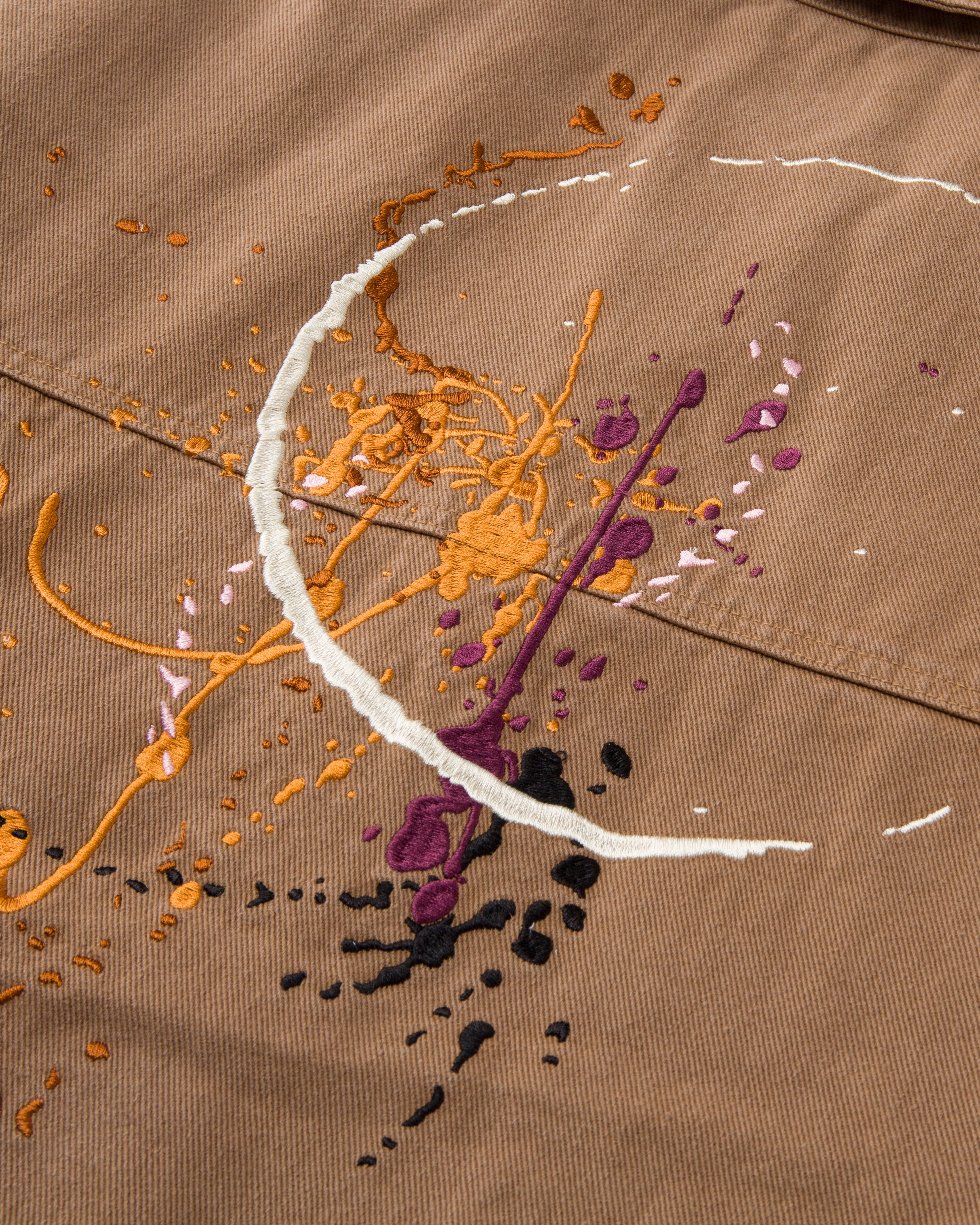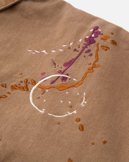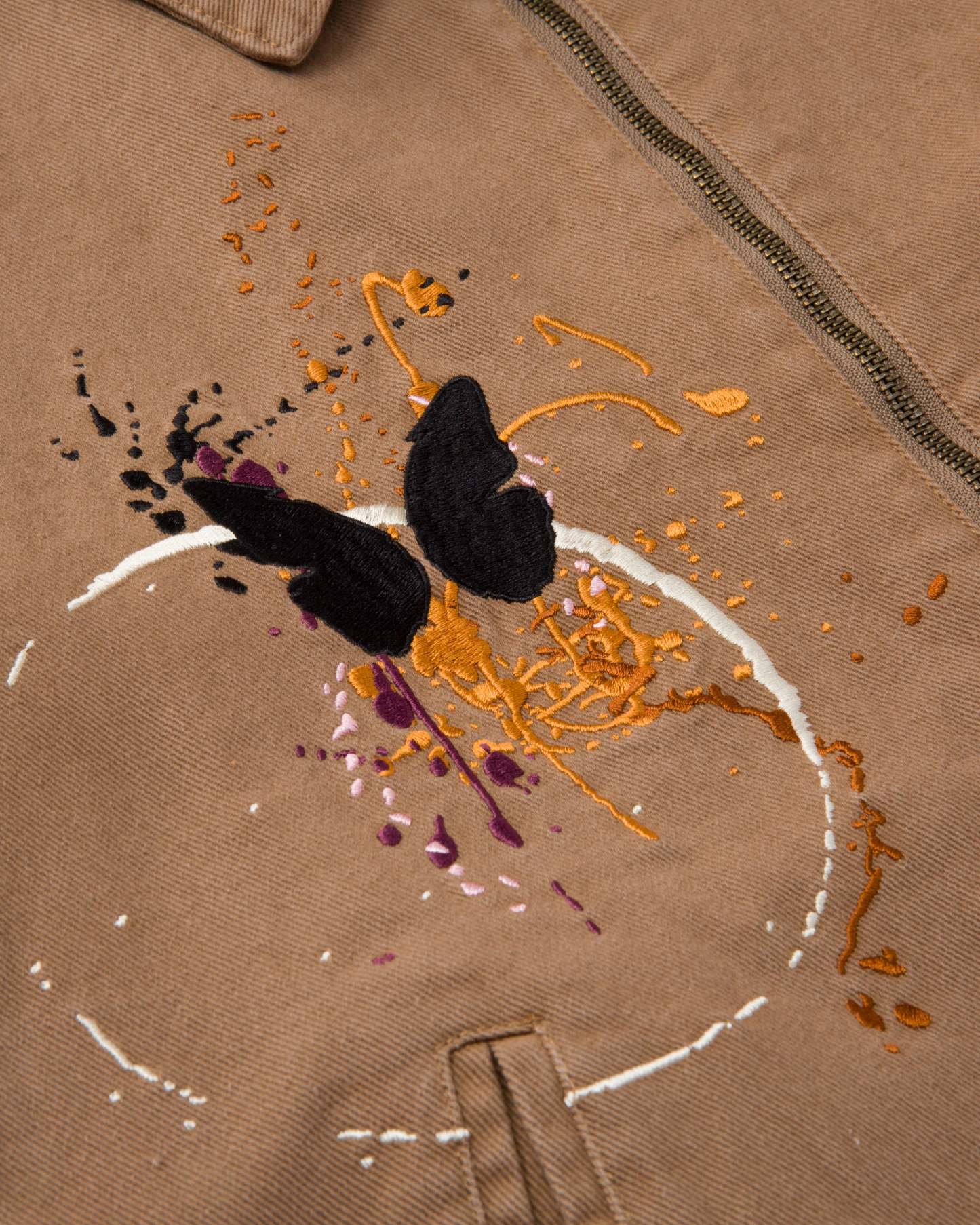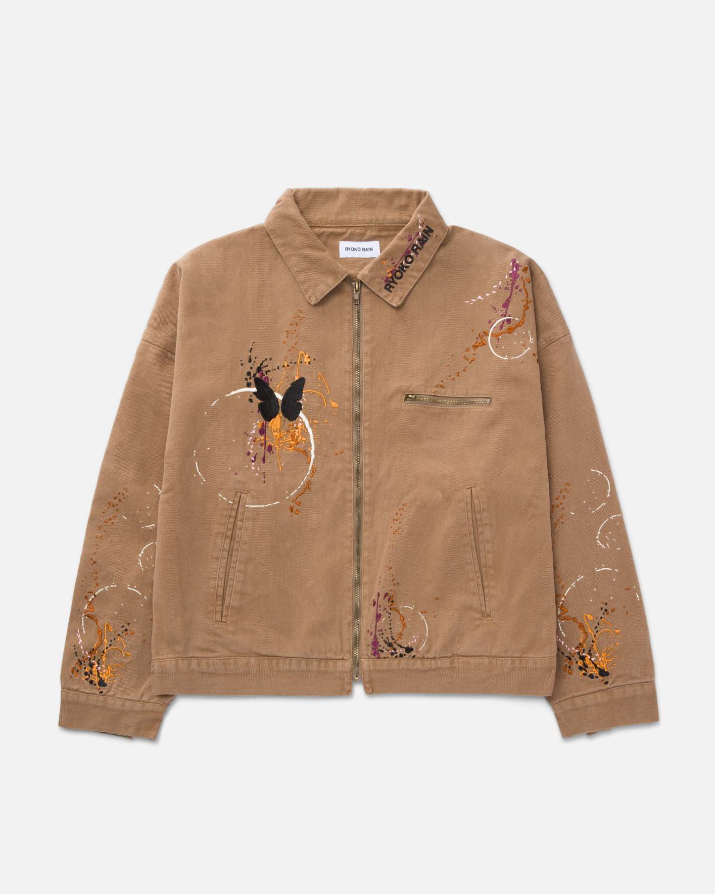 Tan work jacket with embroidered butterfly and paint splatter details. Ryoko Rain embroidery on collar. Brass zippered chest pocket and inner liner pocket.