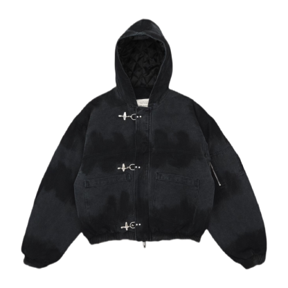 The 15oz Canvas Clasp Bomber Jacket is crafted from heavy-weight cotton canvas and features a hand-dyed pattern, making each piece uniquely textured and one-of-a-kind. Filled with cotton down and lined with quilted nylon, it offers warmth and comfort, while the oversized cropped fit and heavy-duty metal clasp closure add a modern urban edge. Functional details like the double zip, open-end hip pockets, and bomber-style arm zipper blend utility with style, creating a bold and layered statement piece for the urban explorer who values individuality.