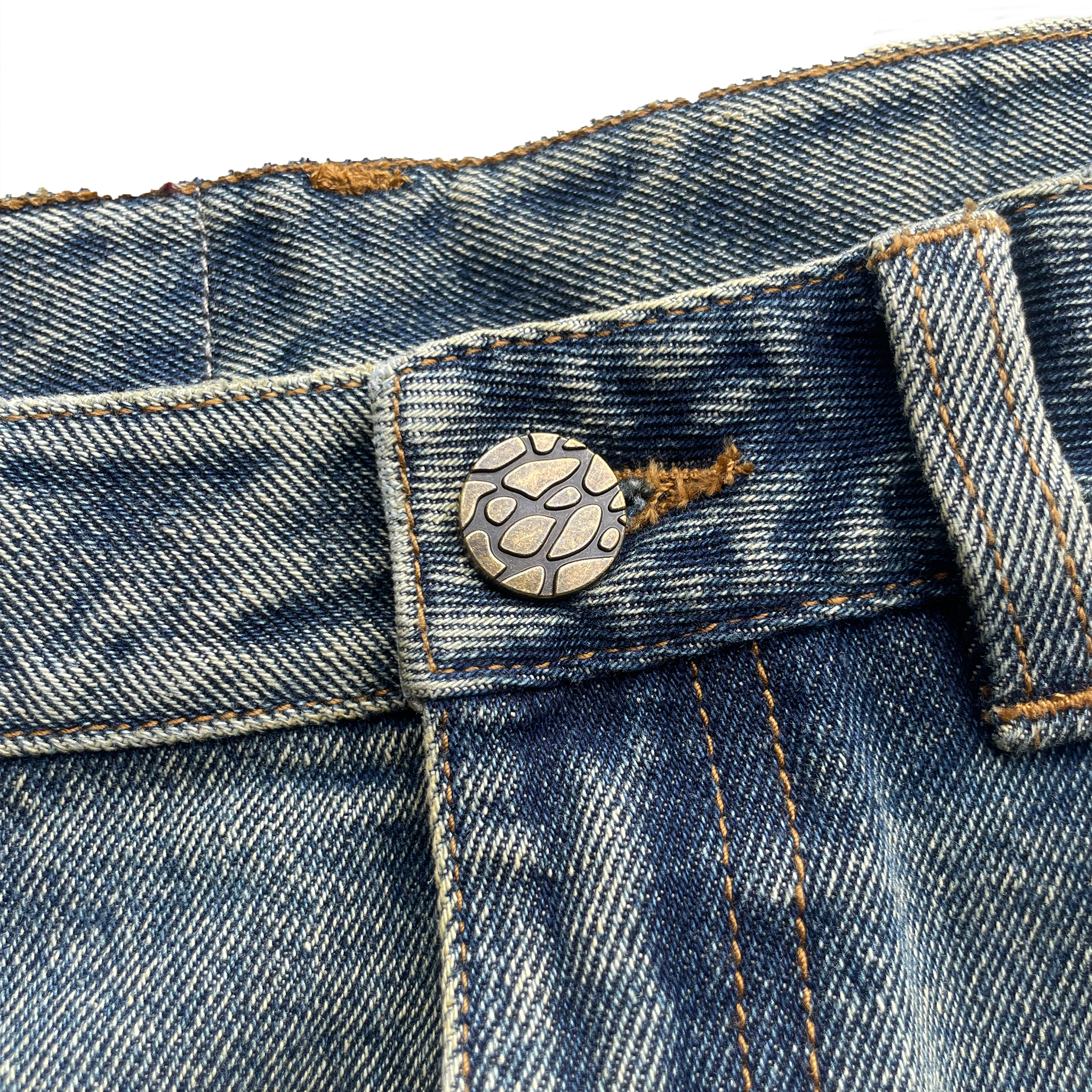 Shadow-dyed fading on front, contrast logo patch at waist