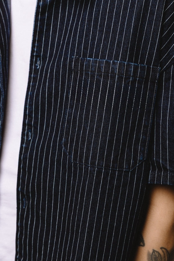 Introducing Our Short Sleeve Shirt in Blue With White Pinstripes. The shirt features one chest pocket with our signature logo embroidered into the upper left side. Cut to a refined boxy, slightly cropped fit making our short sleeve an outerwear essential.