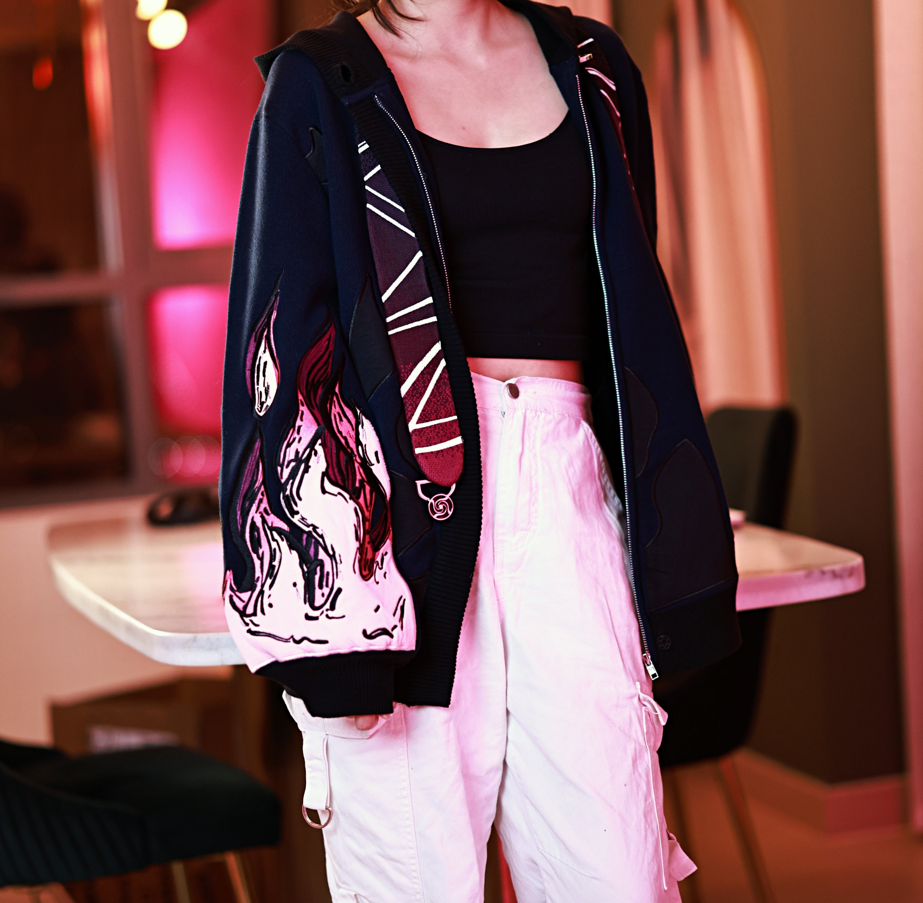 This whole collection features some of the most detailed embroidery we have ever made. The embroidery of Y's sword on the back of this Hoodie has over 120000 stitches and takes 12 hours to produce. Due to this high effort, this will be the only time this design will be offered for this low of a price. The design also features our new magnetic buttons and pendants that let you customize your hoodie and add your own touch! It comes with a set of button top pieces that can easily be interchanged with top pieces from other hoodies from this collection. Your will also be able to purchase complementary top pieces as an add on in the future to further customize these hoodies. The pieces are made from high quality metal and black resin. The fabric is made from the highest quality 100% cotton yarns. The design also features unique embroidered appliqué flame patterns on the body and sleeves that are inspired by Y's cursed energy. I also has a curved Zipper to give this design an even more unique look.