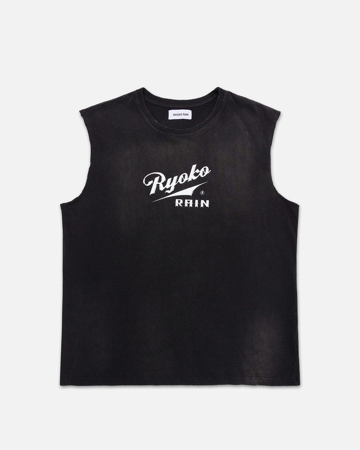 100% Cotton. Imported. Printed and finished in Orange County, CA. “Sun-faded” potassium sprayed sleeveless tee. Sleeves have been hand-cut and left with a raw-edge finish.