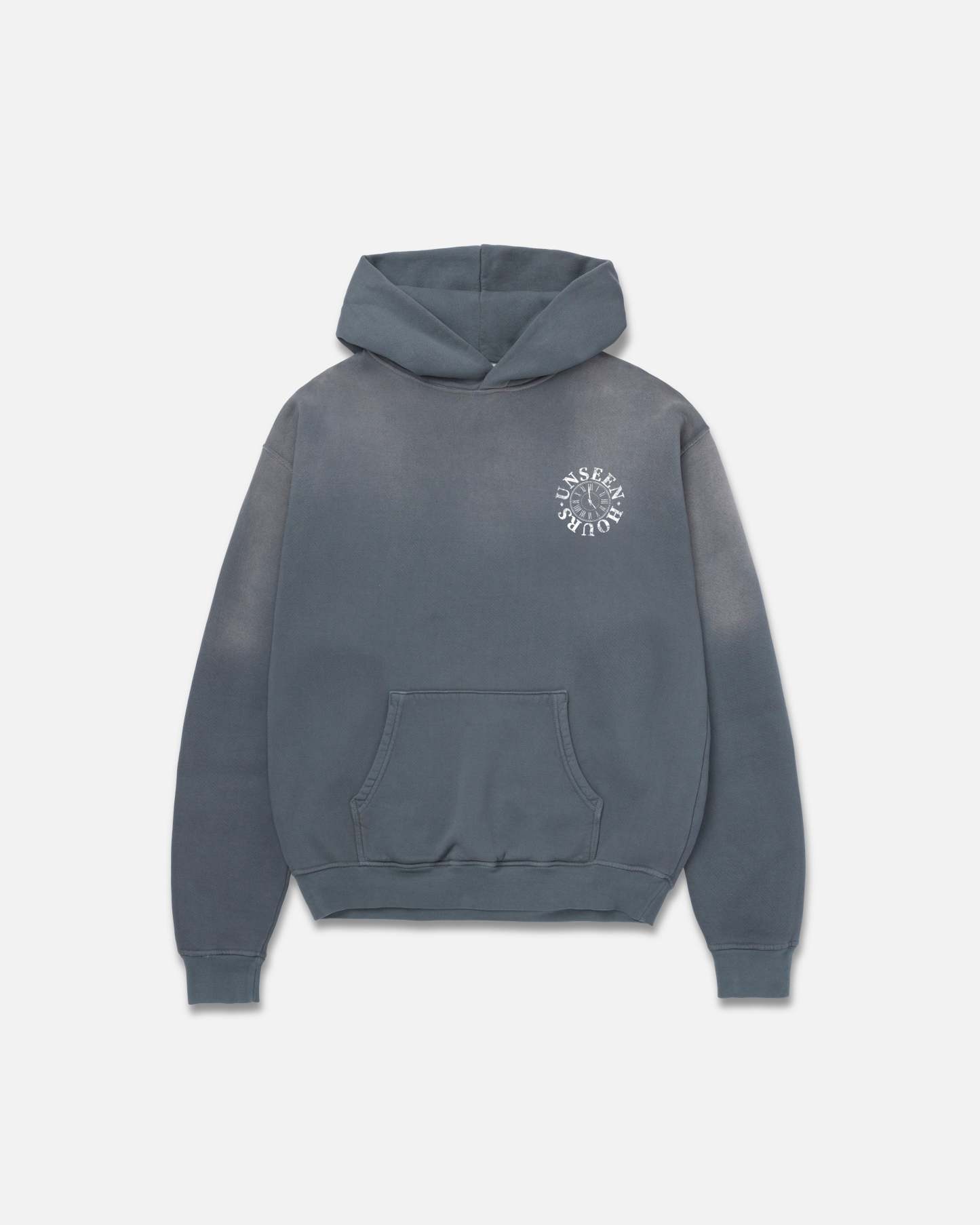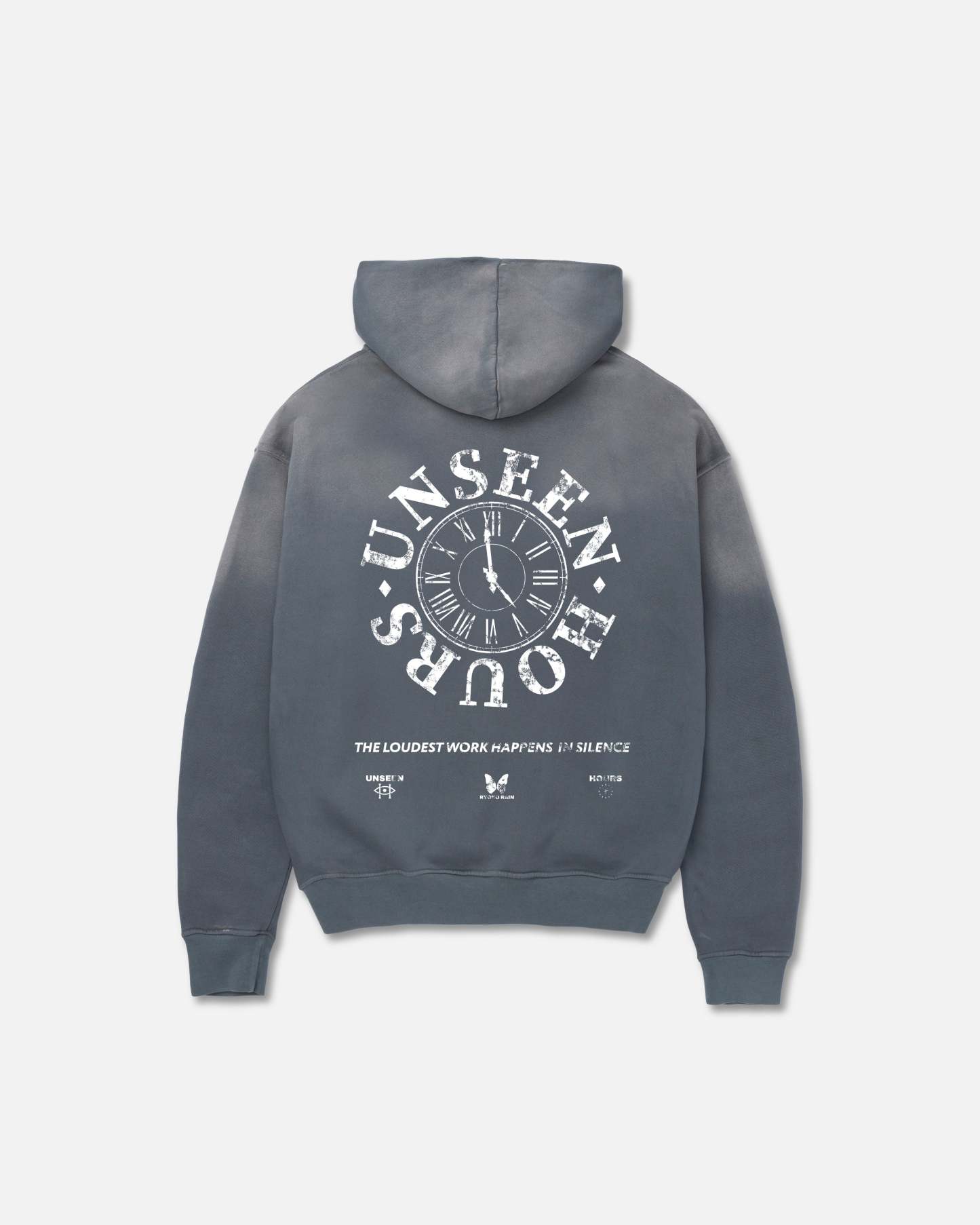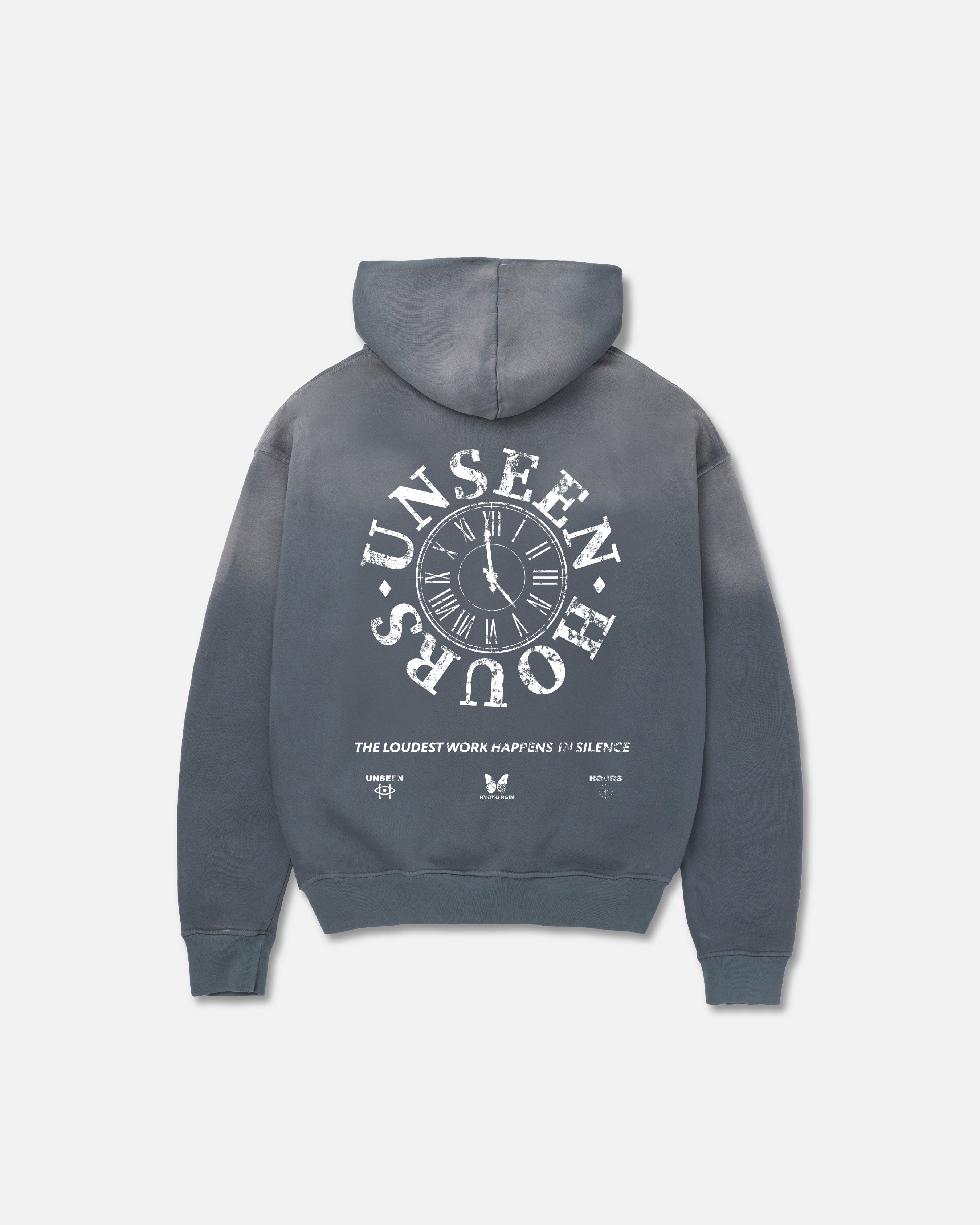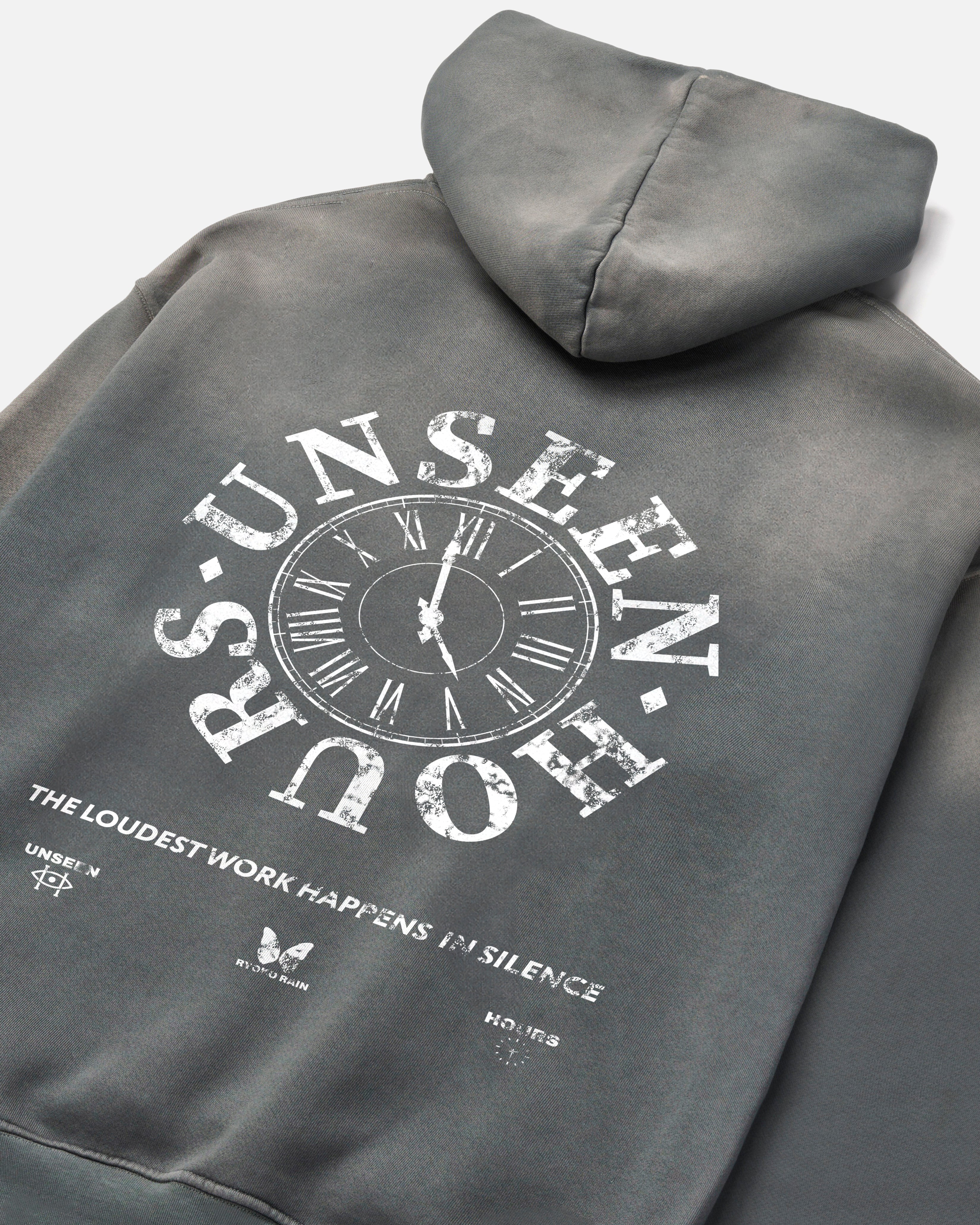 Grey garment-dyed hoodie with a vintage stone washed fade across the hood and shoulders. Left chest tonal distressed UnseenHours clock logo and large white distressed UnseenHours print on the back. Soft micro-ribbing on cuffs and band.