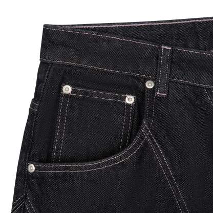 14,5oz raw denim / 100% cotton / fan-cut / embroidery on front back / wash inside out / straight fit / fits true to size