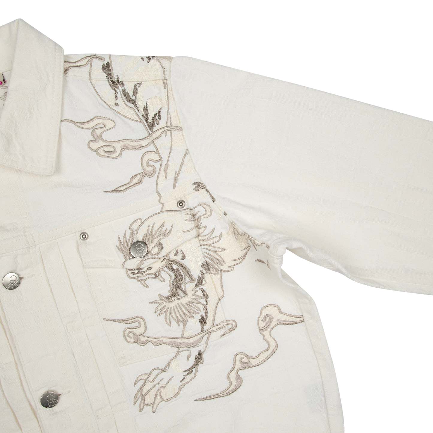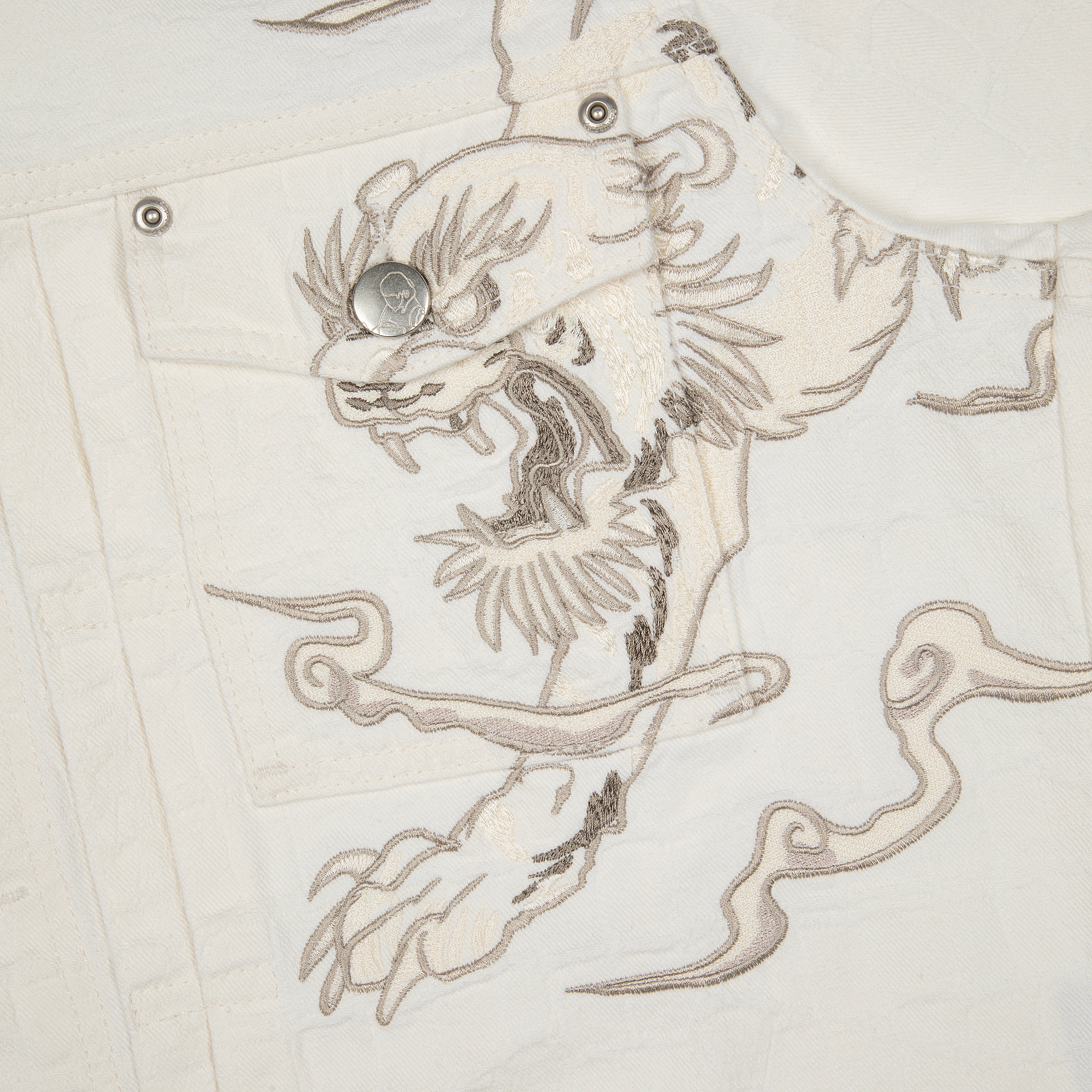13oz jacquard patterned denim / 100% cotton / embroidery on front and back / custom buttons / fits true to size