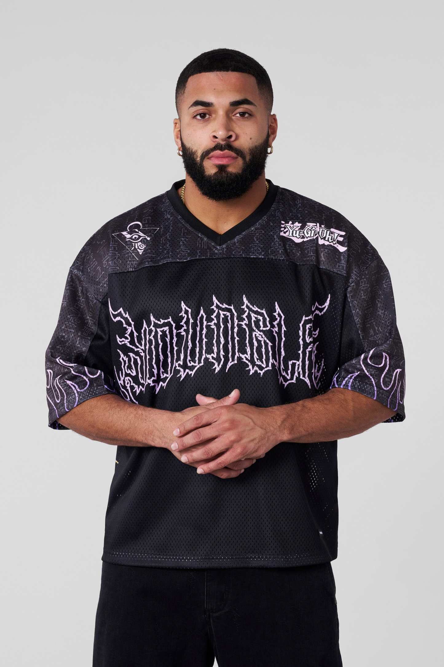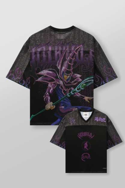 DESIGN: A bold statement piece, this boxy-fit mesh jersey features striking character graphics from the Yu-Gi-Oh universe. Designed on a black fabric-washed base, it showcases all-over prints with intricate details, blending streetwear with anime nostalgia.