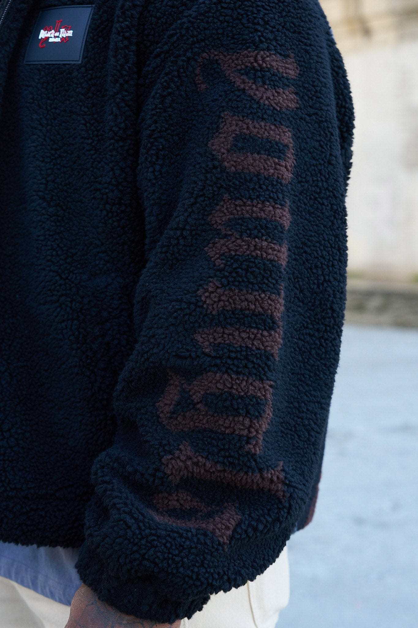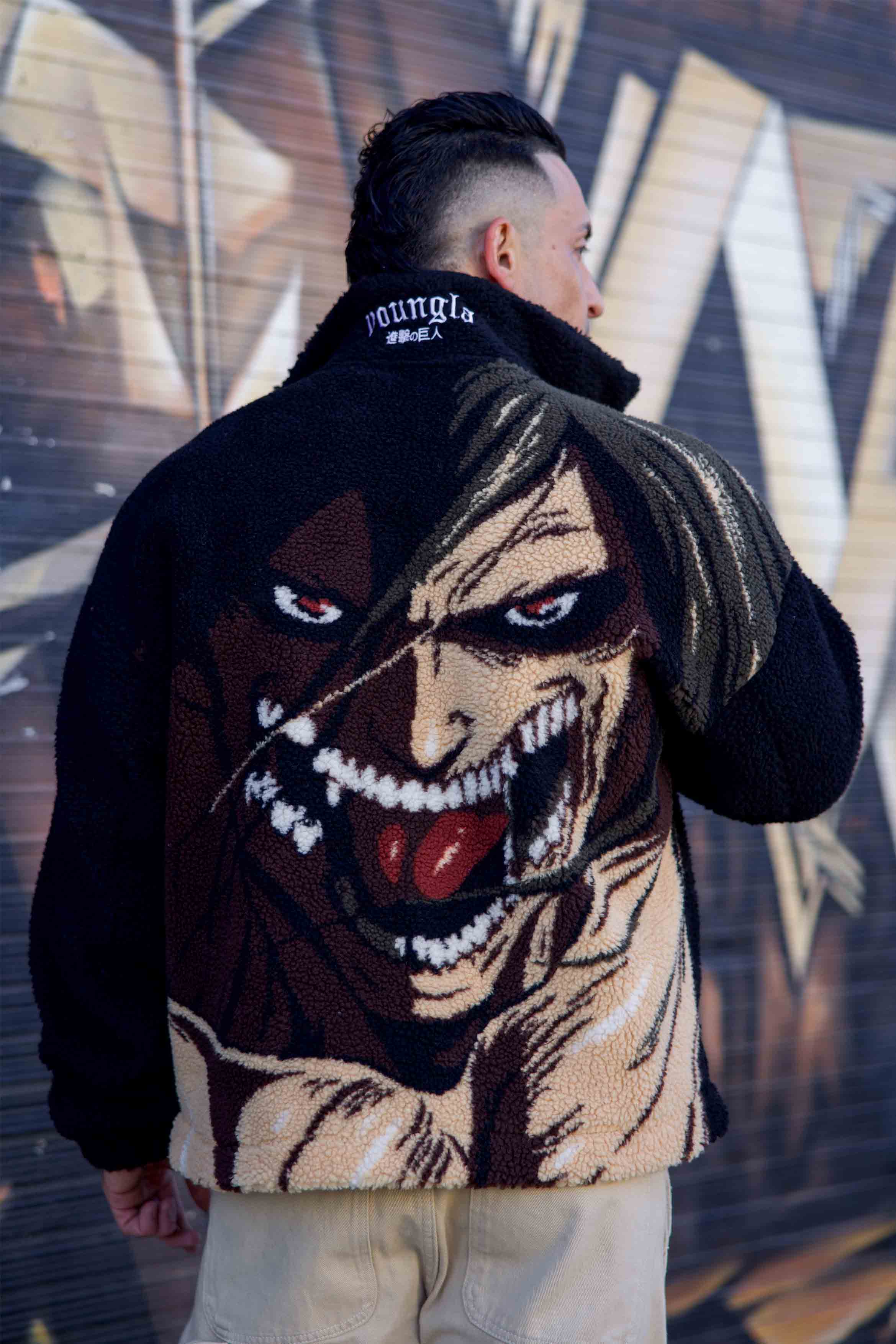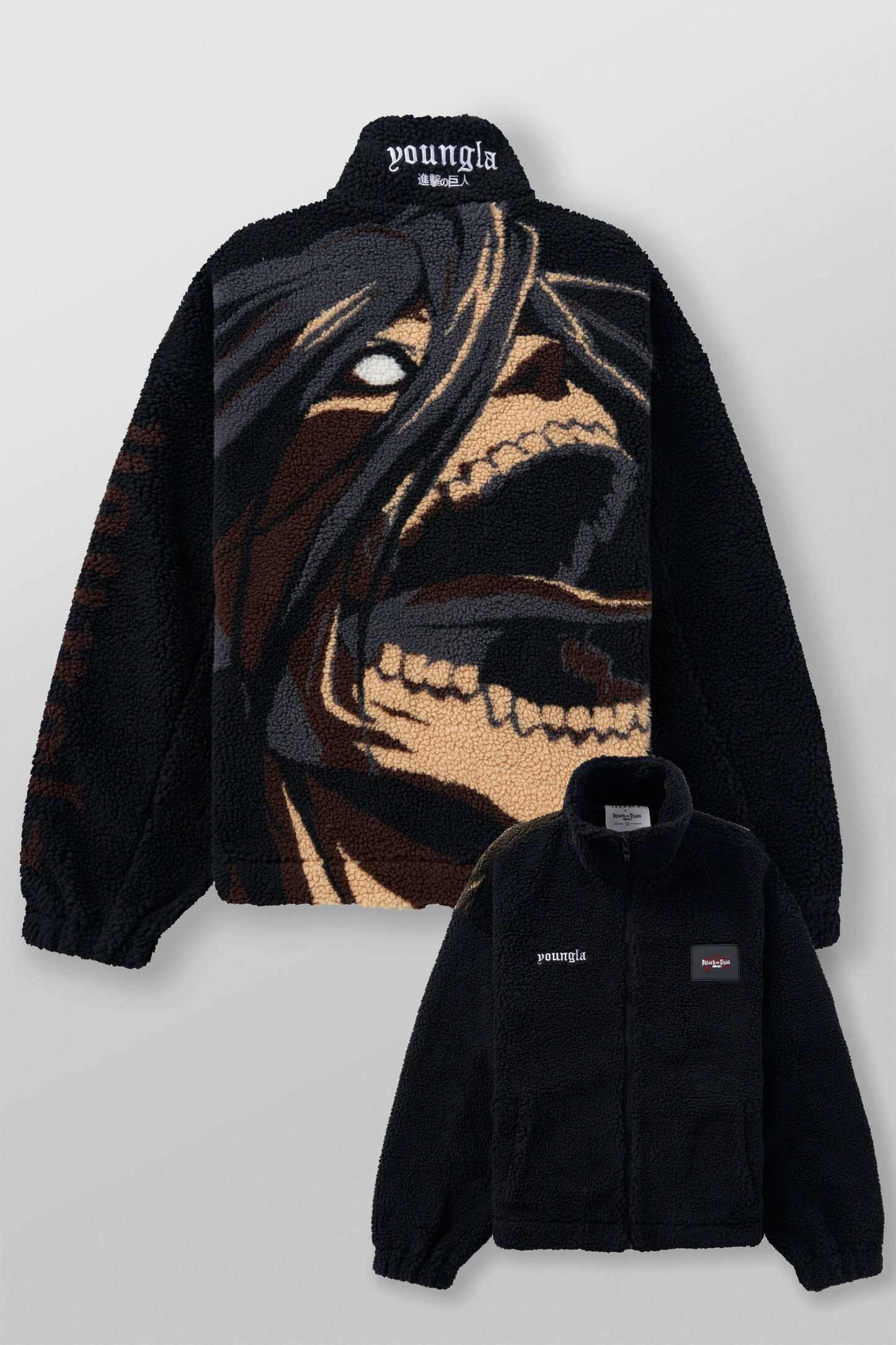 DESIGN: The YoungLA x Attack on Titan Sherpa Jacket is the perfect blend of style and comfort. Made with plush sherpa fabric, this zip-up winter essential features bold AOT graphics on the back, bringing your favorite series to life in a cozy design.