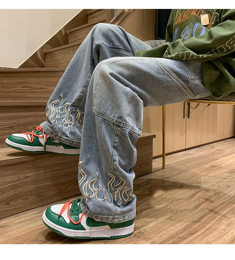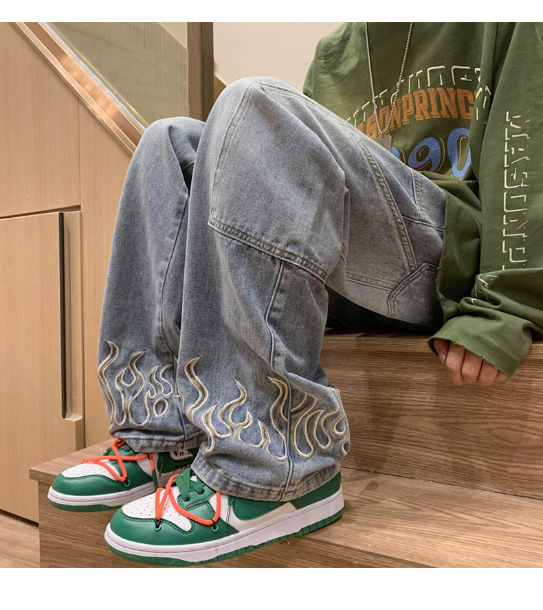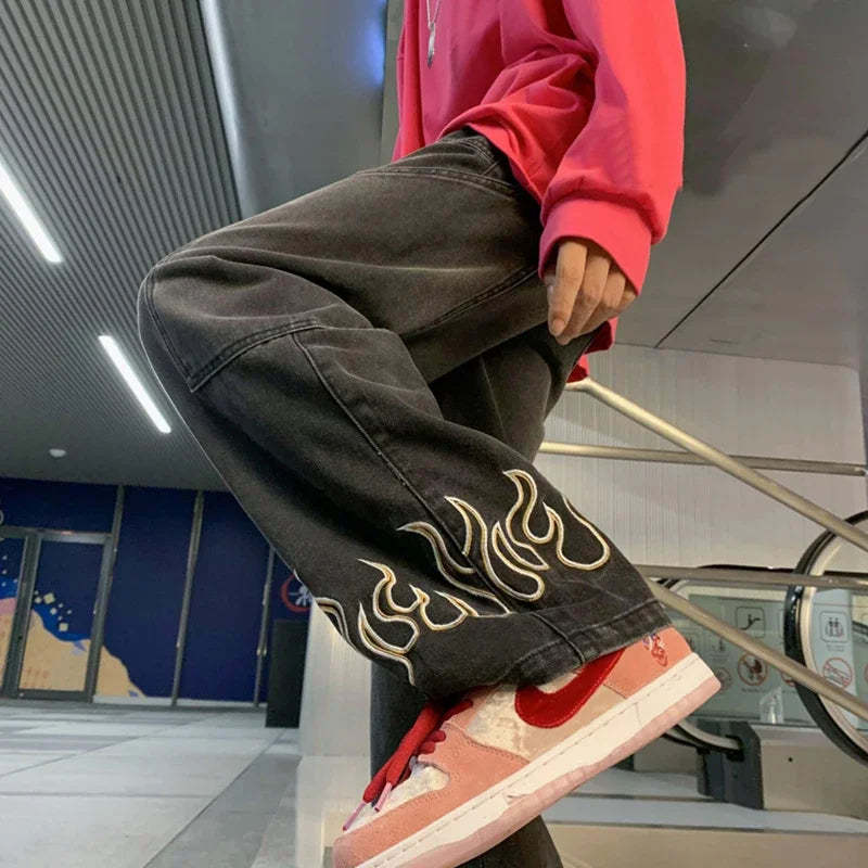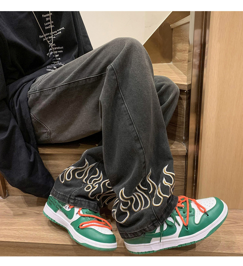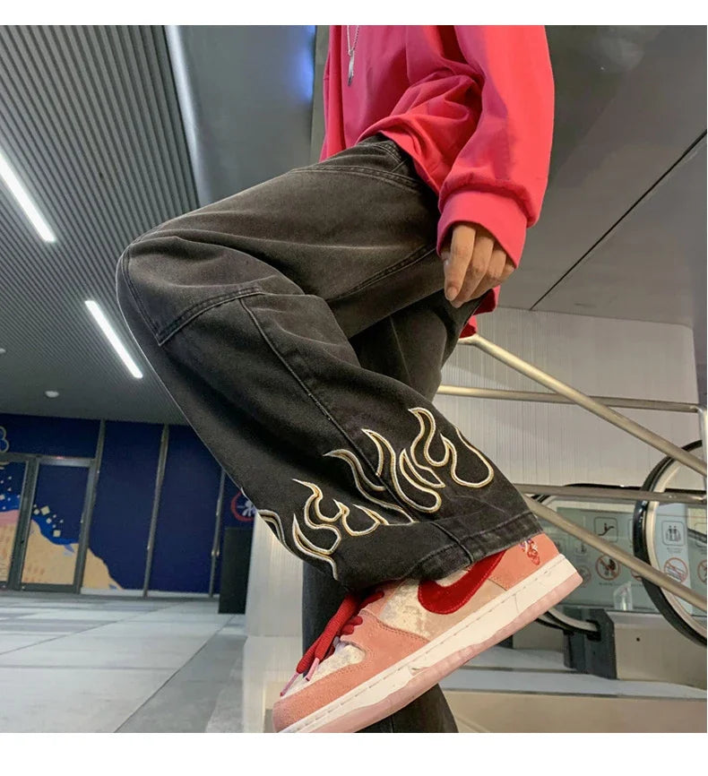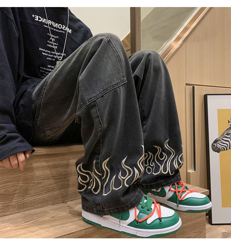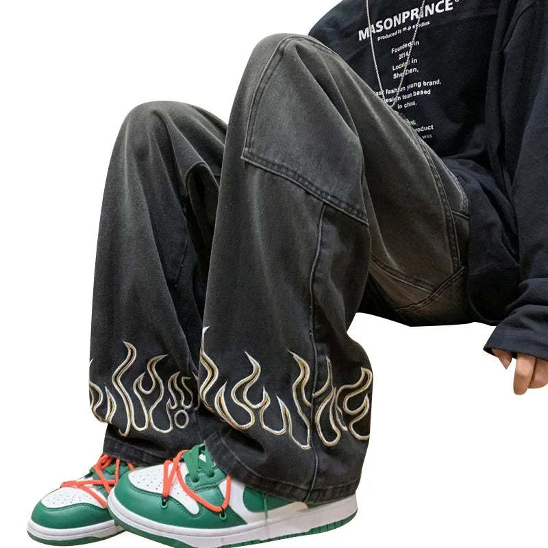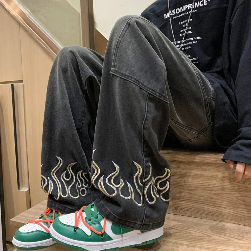 American Street Jeans Men Y2K Fall Design Feel Flame Embroidery Straight Casual Pants Fashion Brand Loose Wide Leg Pants Denim