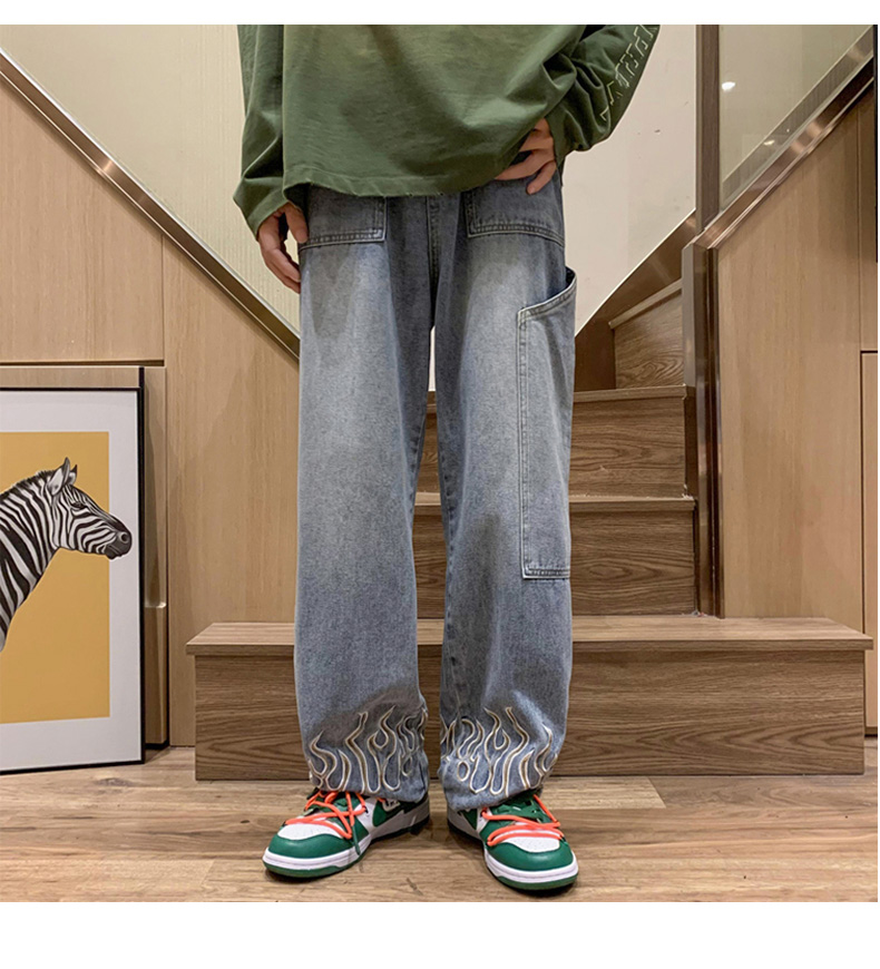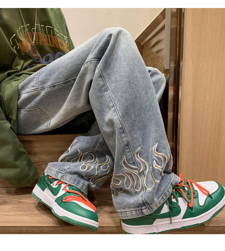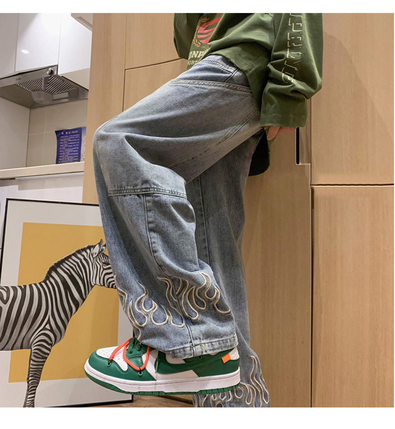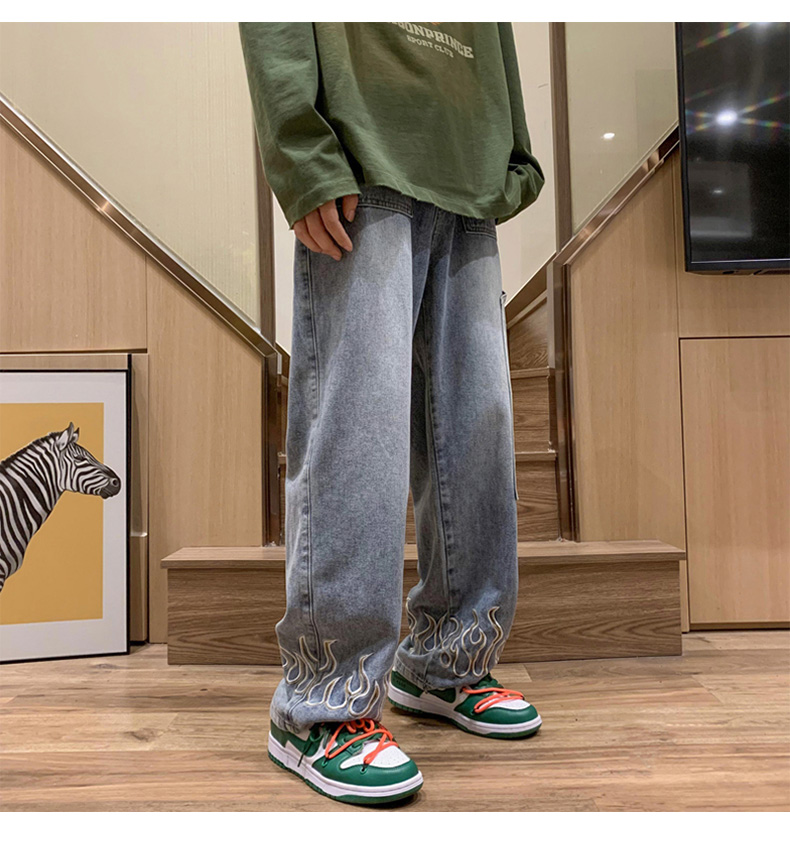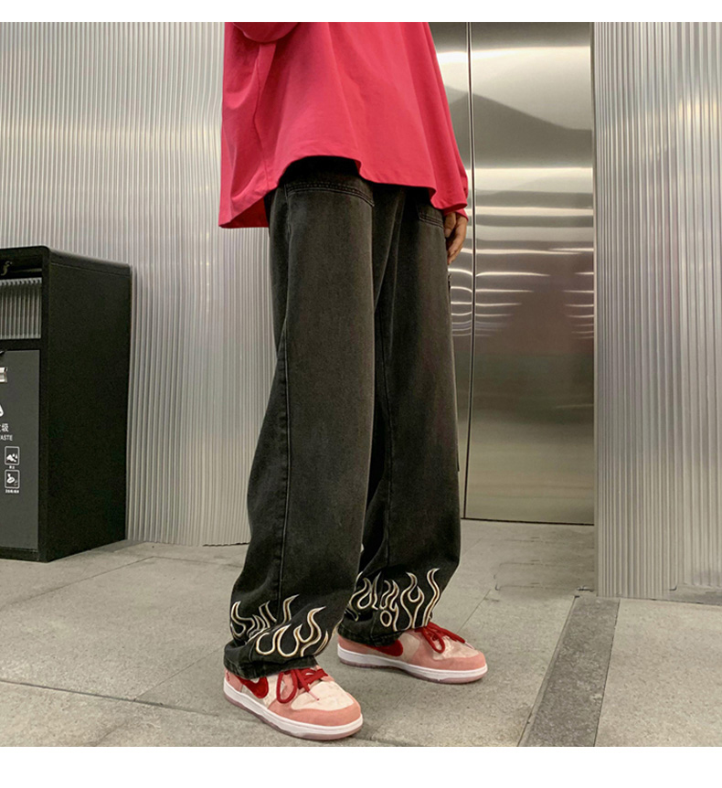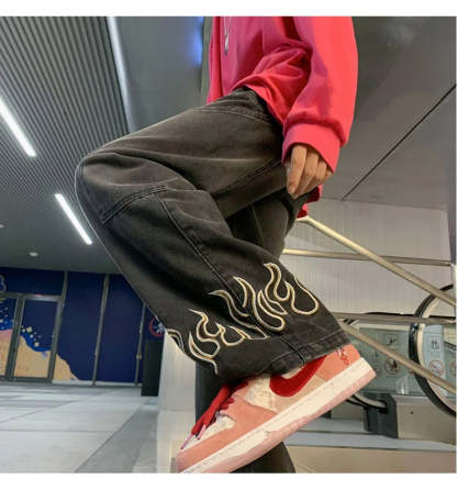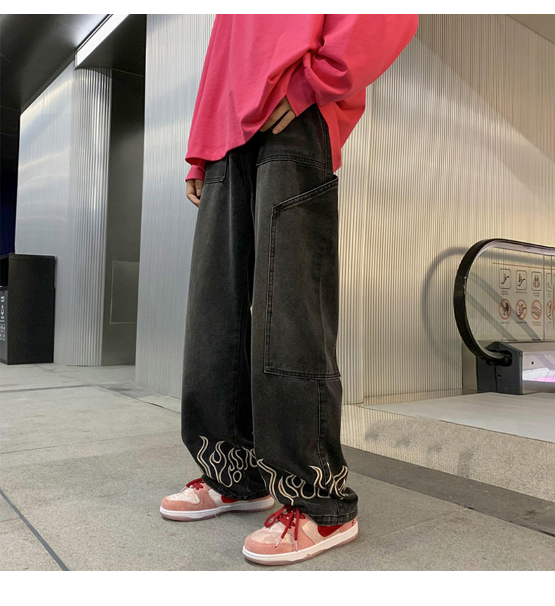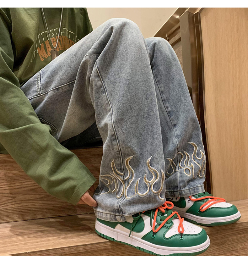 American Street Jeans Men Y2K Fall Design Feel Flame Embroidery Straight Casual Pants Fashion Brand Loose Wide Leg Pants Denim