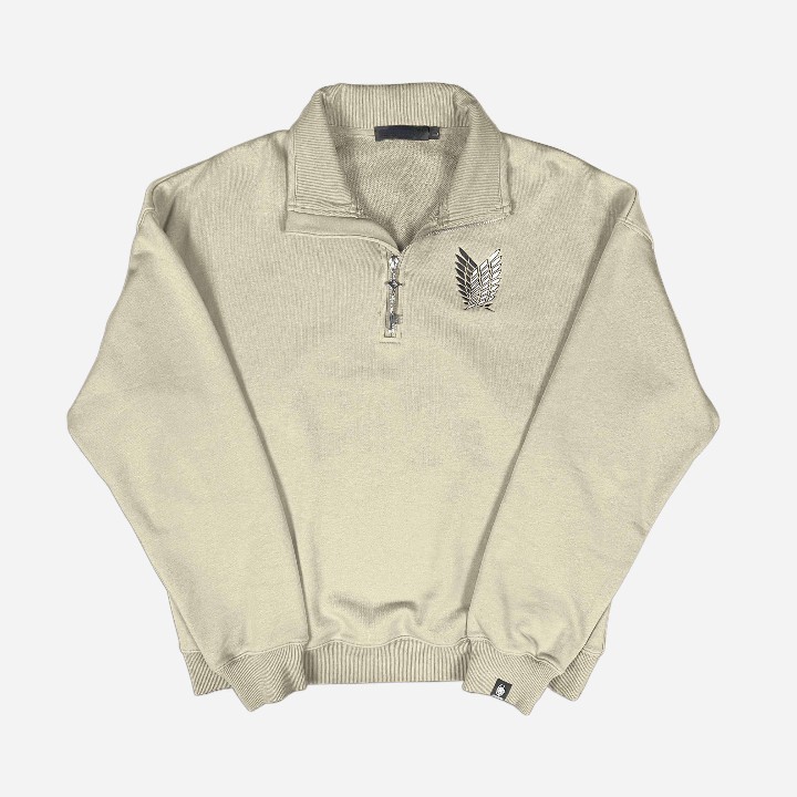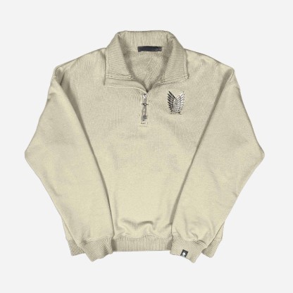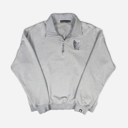 The Wings of Freedom Quarter-Zip in Storm Grey Dark Sea Green is crafted from luxury heavyweight cotton, with a relaxed fit. It features an embroidery on the front and the sleeve. The zipper is the key to Eren's basement.