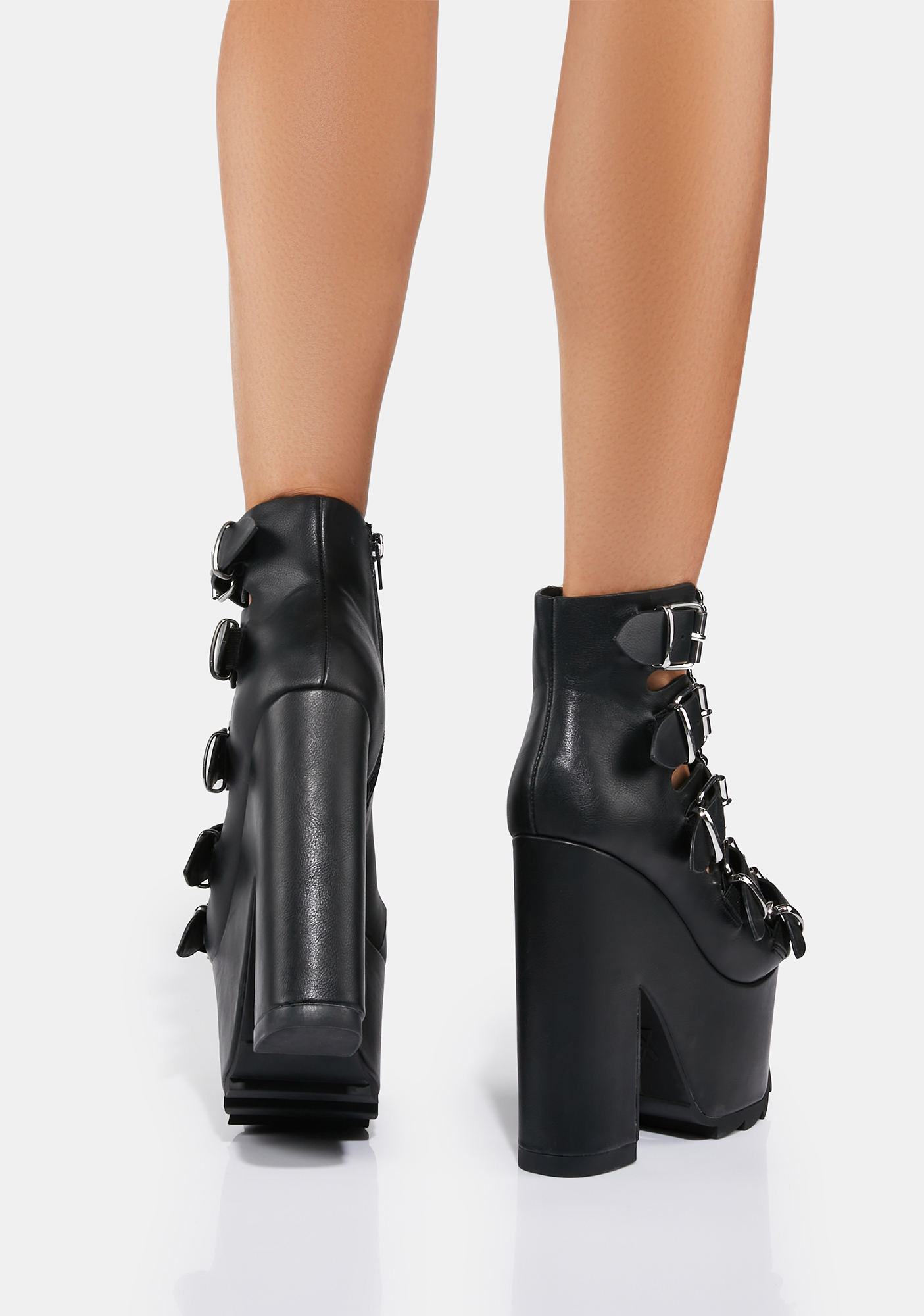 Black Dreamscape Skull Platform Heels will take you sky high, babe. These vegan leather platform heels have multicolored buckle straps, skull and crossbones enamel details, and side zip closures.