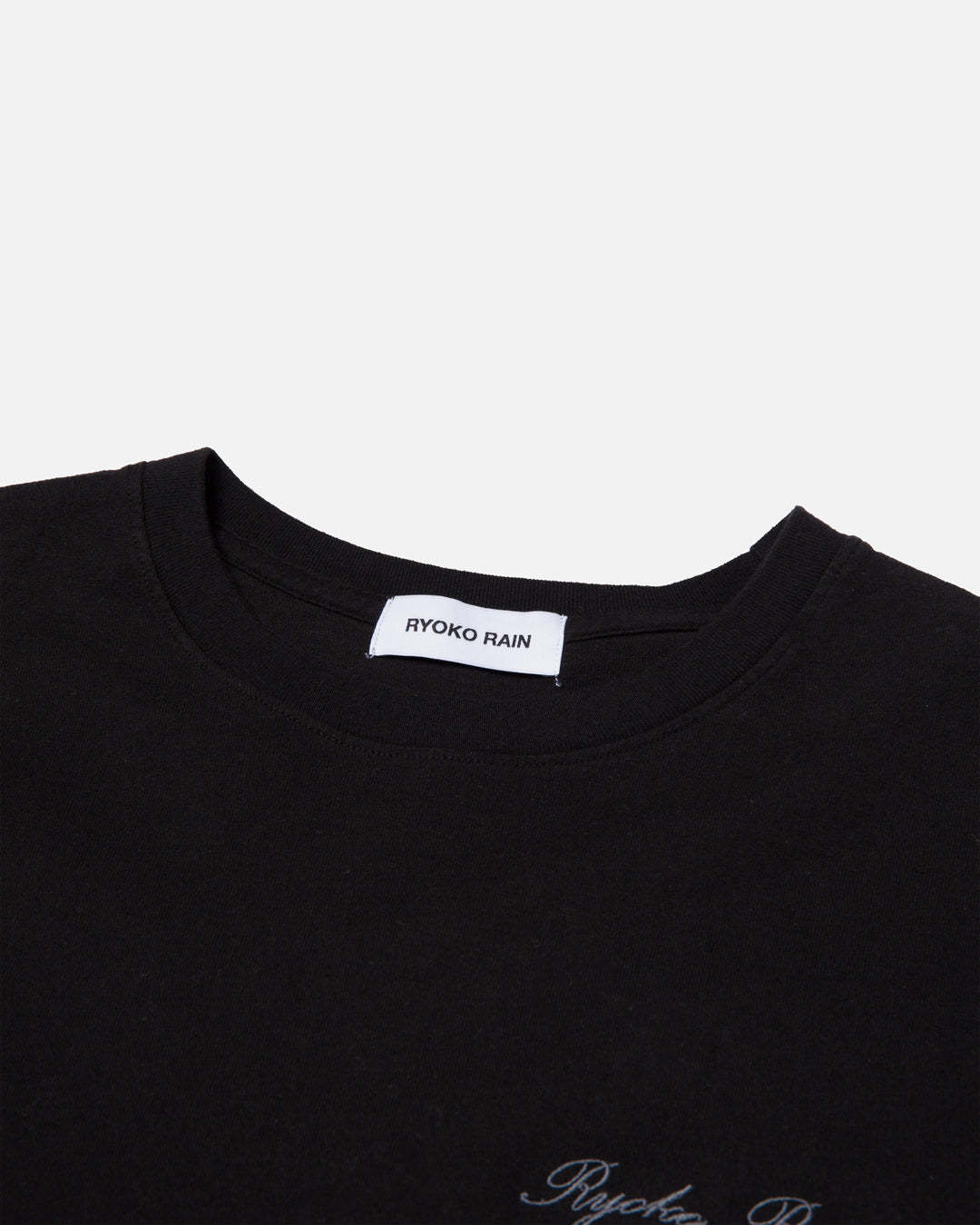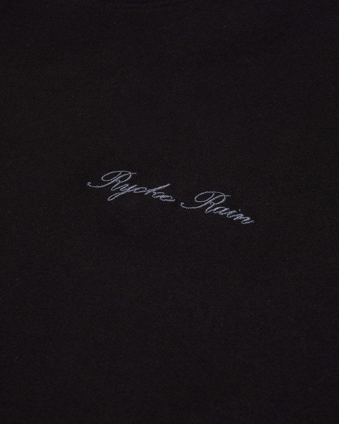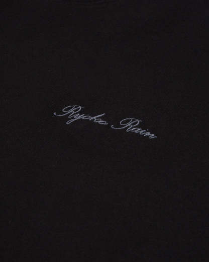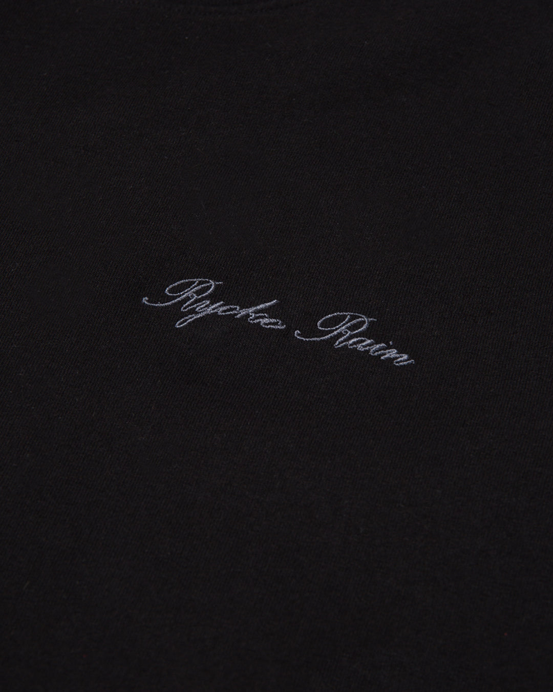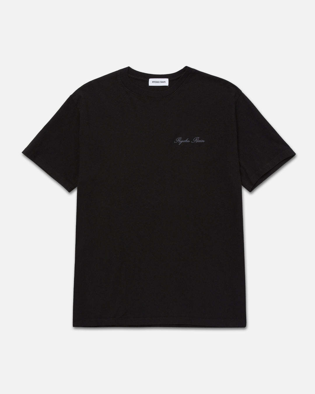 100% Cotton. Ryoko Rain Black tee with left chest embroidery. Designed and finished in Orange County, CA. Produce in Los Angeles, CA.