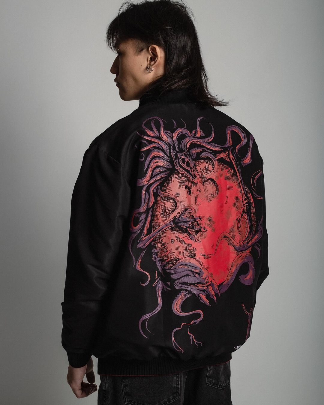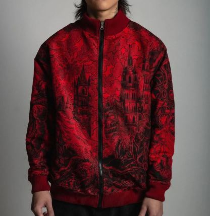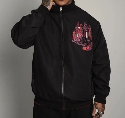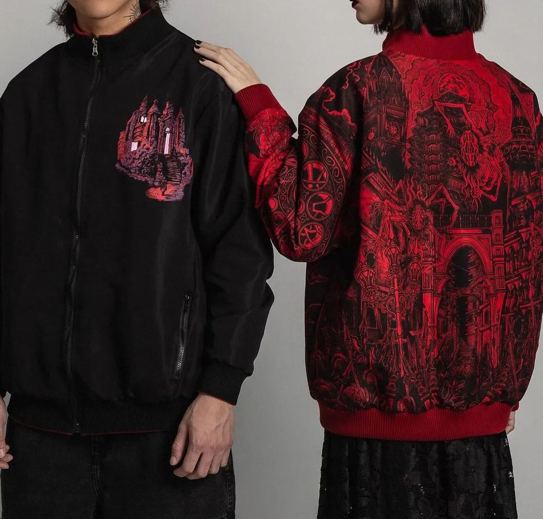 Double-sided bomber jacket, colored art on the black side and full-print art on the crimson side, screen-printed.