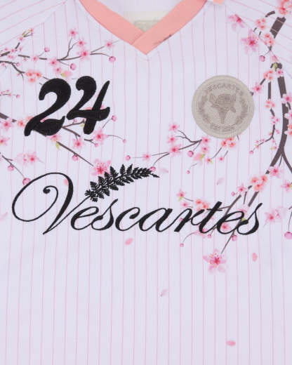 Features fine pink pinstripes running across all panels and printed cherry blossom branches running down from the shoulders over the front and back. contrasted by a pastel pink collar and sleeve trim. Finished with embroidered 'Vescartes' brand logos on the front and back.