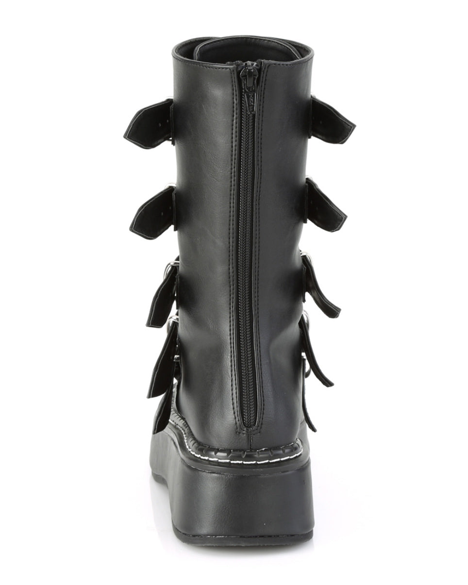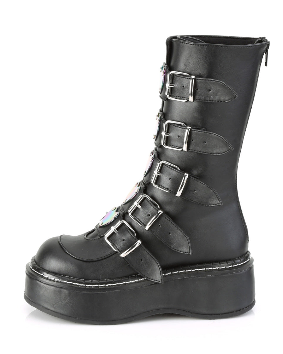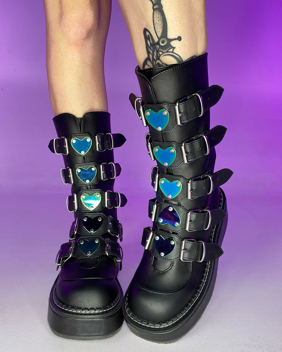 2" (51mm) Platform Mid-Calf Boot Featuring 5 Buckle Straps w/ Colorful Plating Heart Shaped Metal Plates at Center, Back Metal Zip Closure