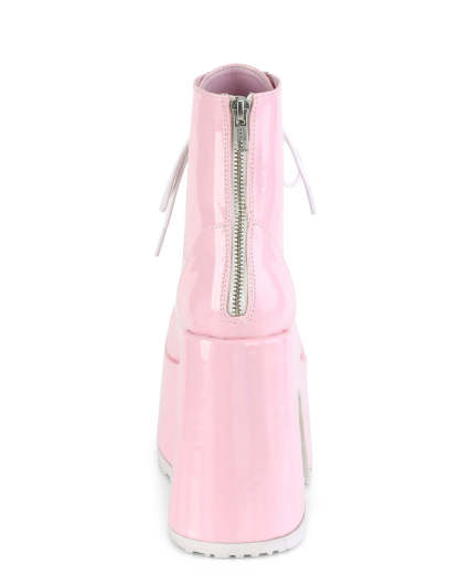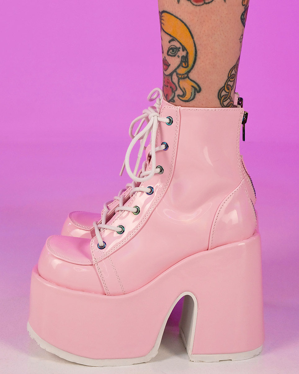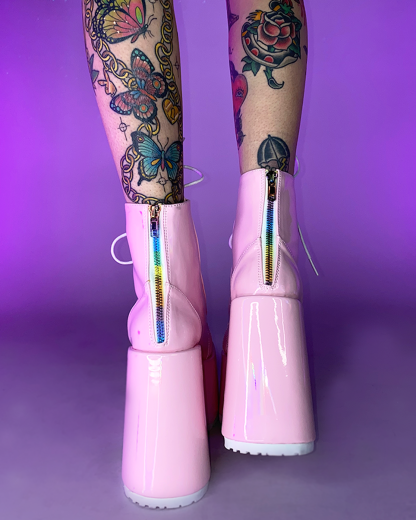You're guaranteed to stand above the rest in these gorgeous pink holographic lace-up ankle boots. Features full back-zip closure for easy on off wear!