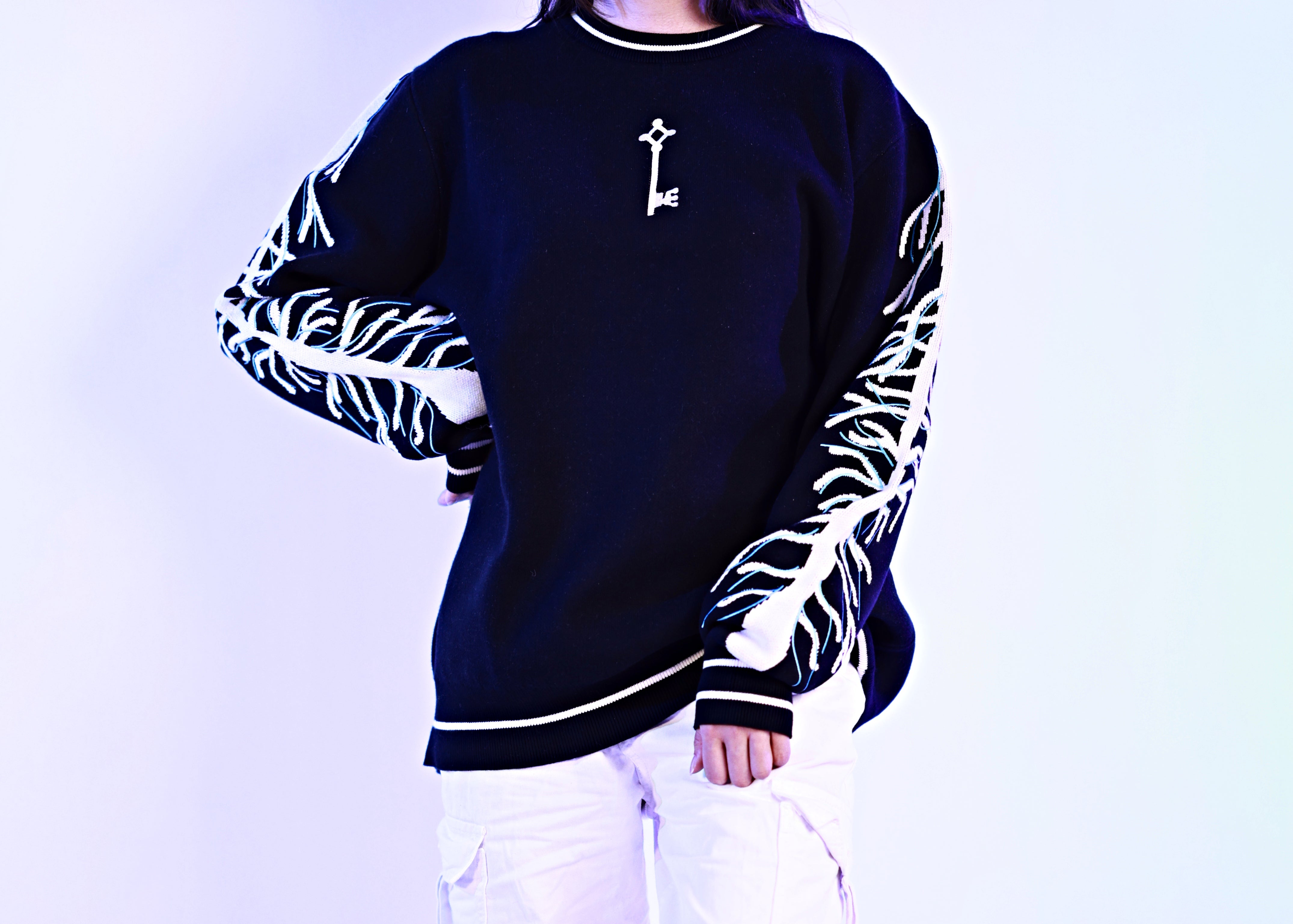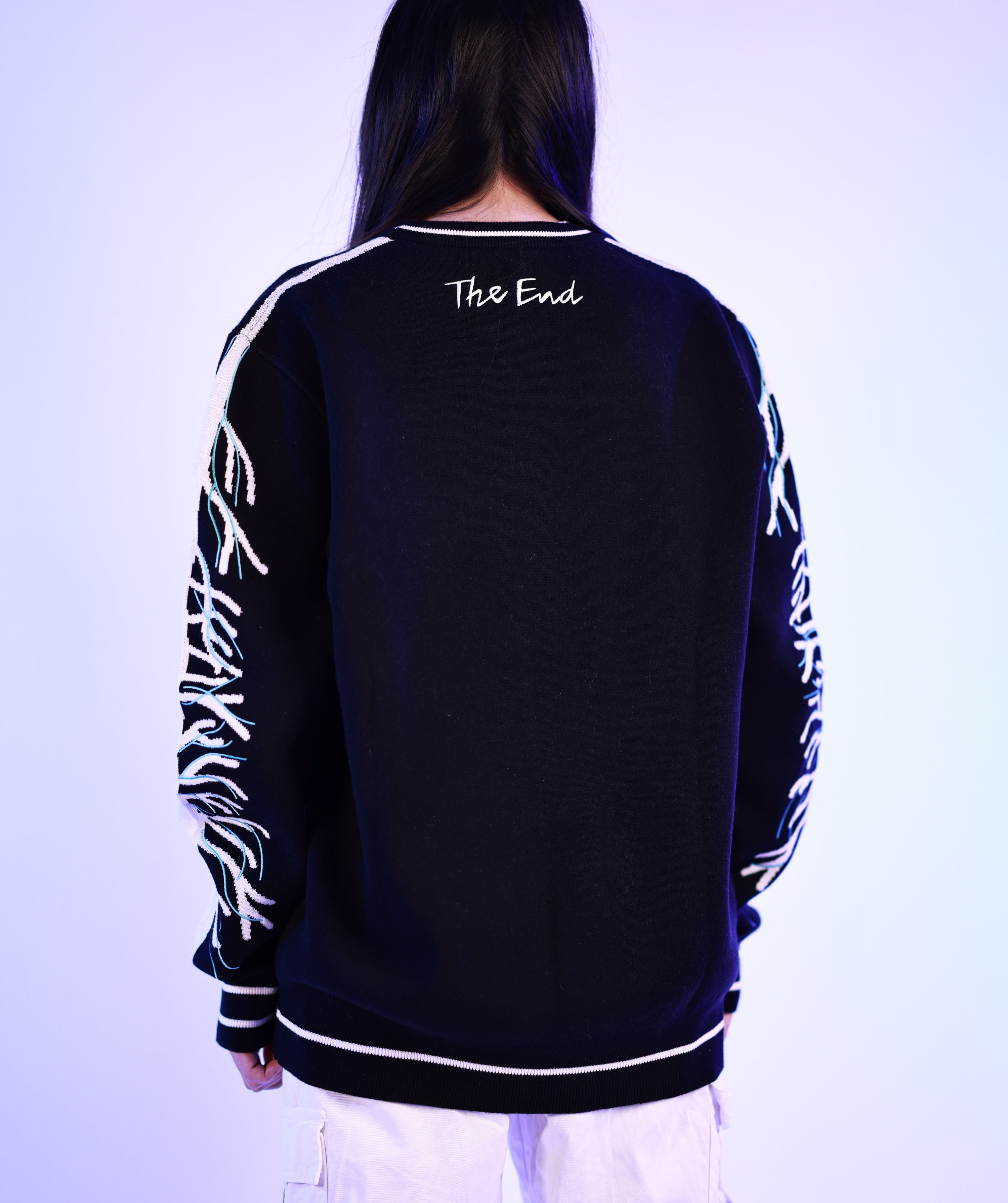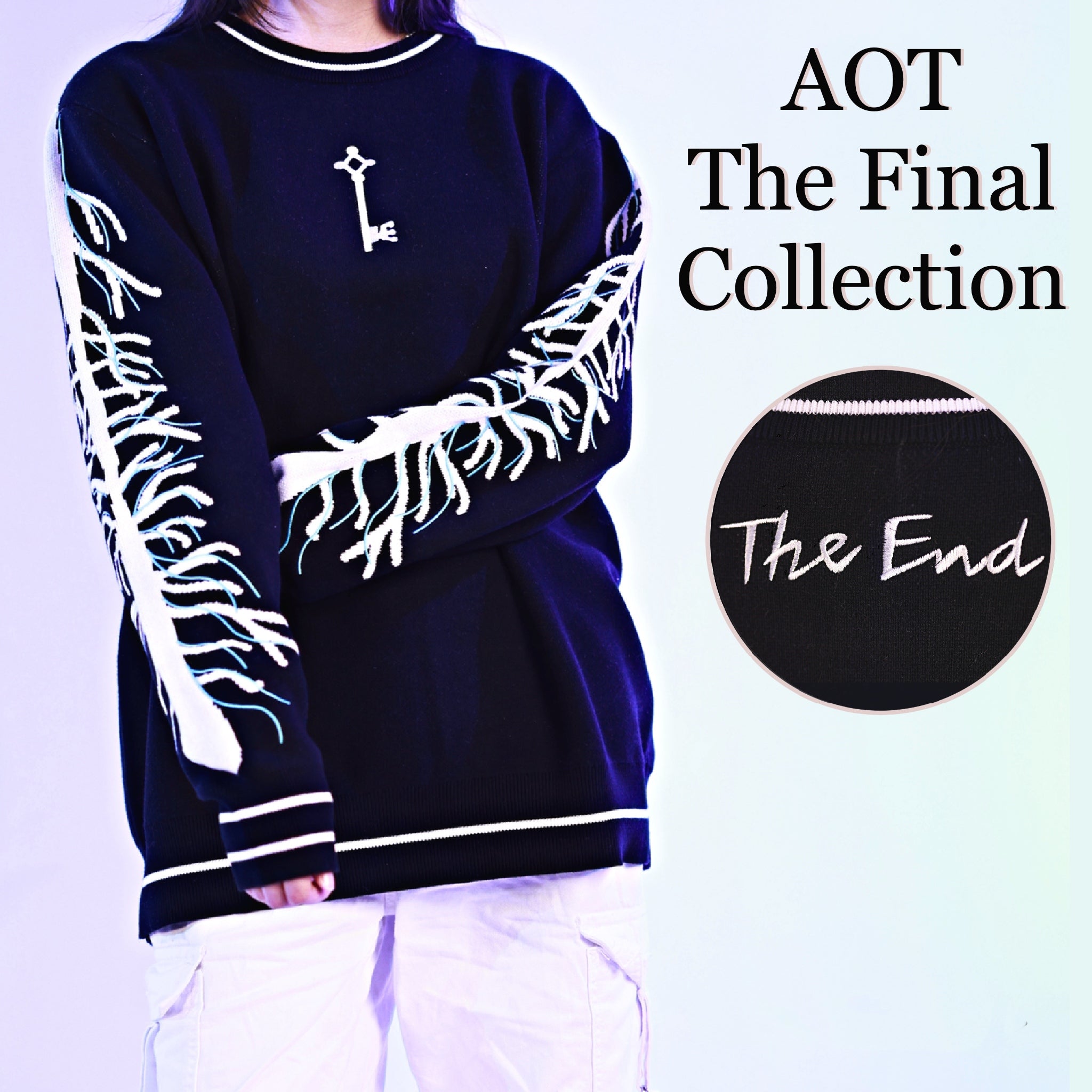 The design is inspired by Eren and has a unique pattern made from a mix of embrodiery and jacquard on the sleeves. The fabric is made from the highest quality 100% cotton yarns and features an embroidery design of Eren's key and "The End" on the back.