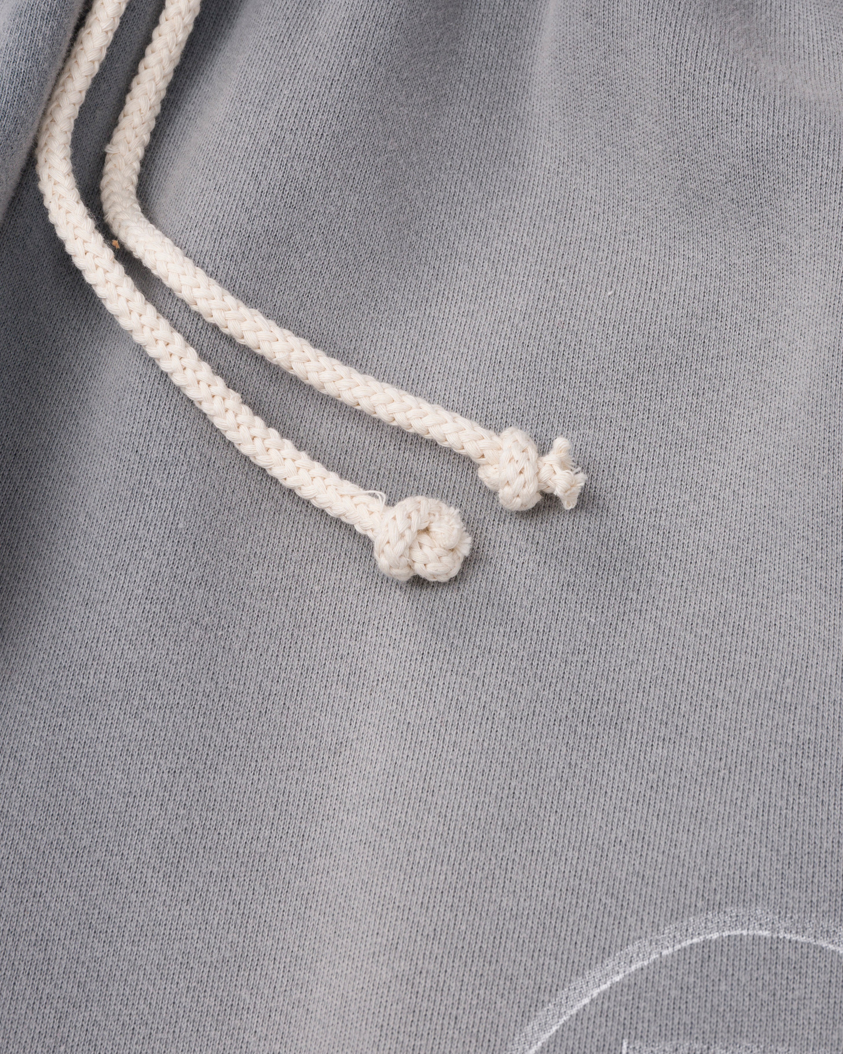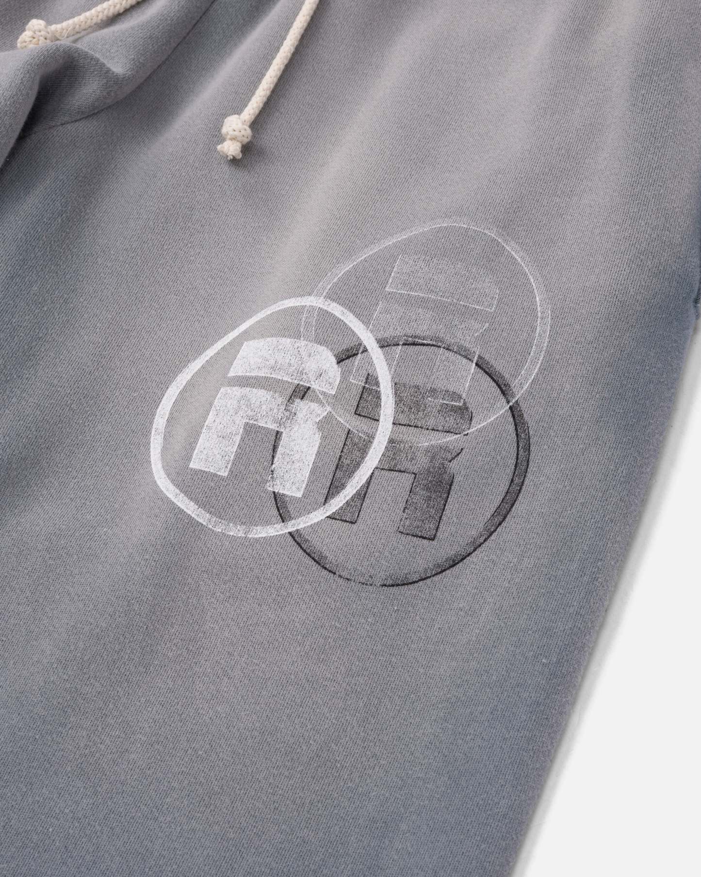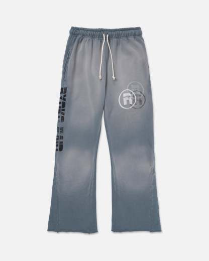 Ryoko Rain grey garment-dyed sweatpants with a vintage stone washed, distressed fade. Features additional side paneling for a flared look and a raw bottom hem. Distressed tonal Ryoko Rain circle logo pocket print with a faded black side hem Ryoko Rain screen print. Cream woven drawcord. Custom knit in Los Angeles, CA.