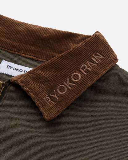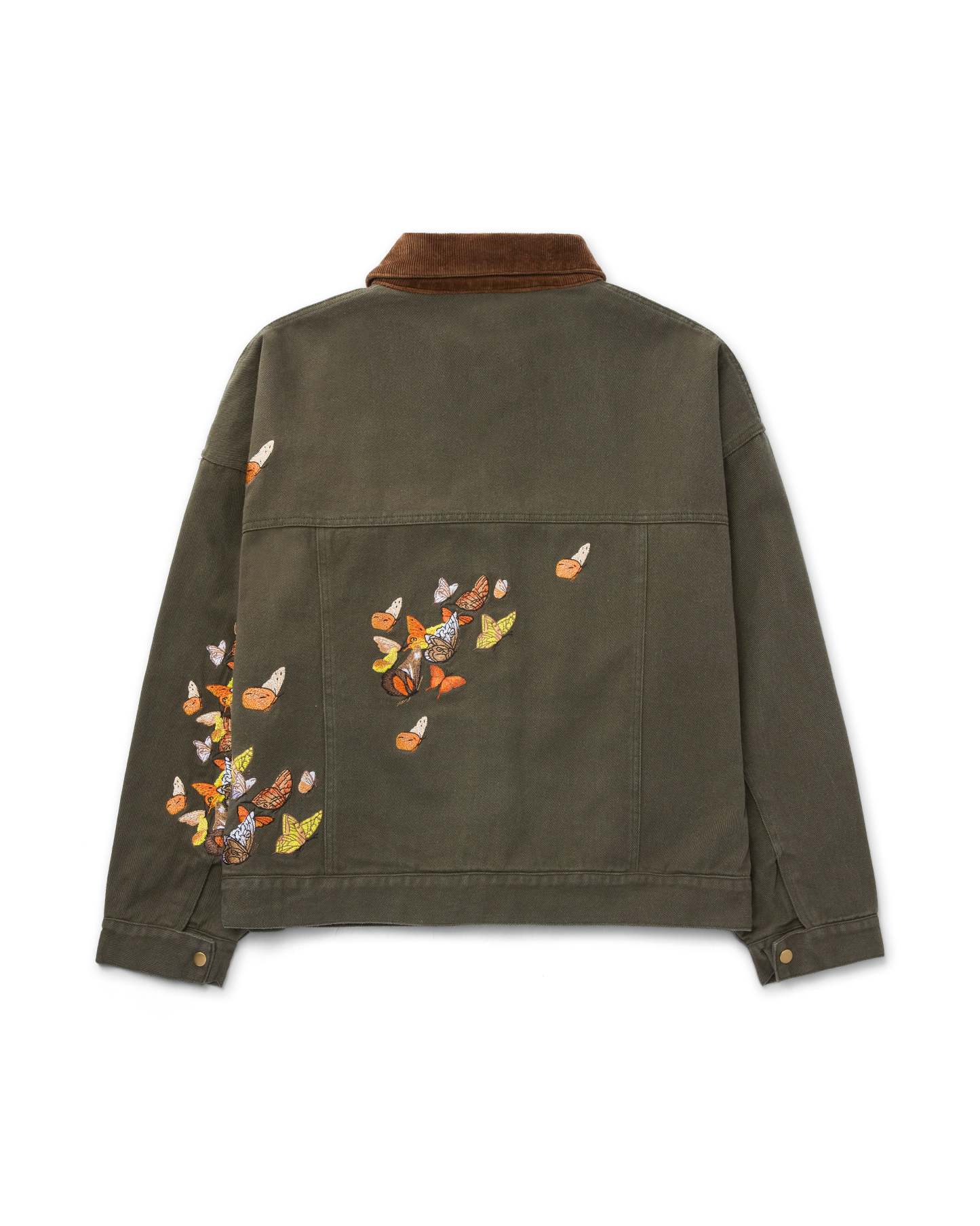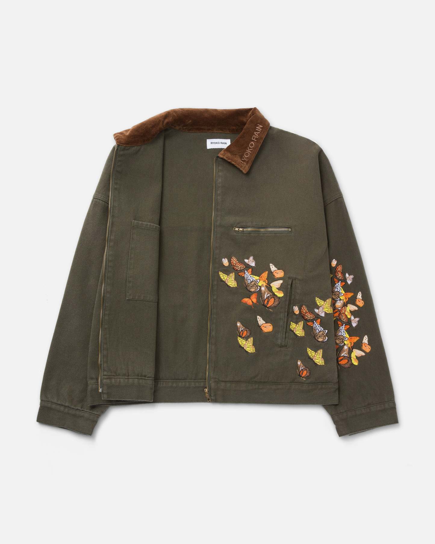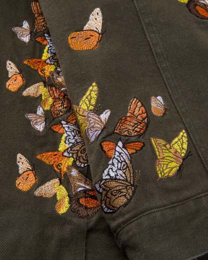 Green work jacket with multi-colored embroidered butterfly details. Ryoko Rain embroidery on collar. Brass zippered chest pocket and inner liner pocket.