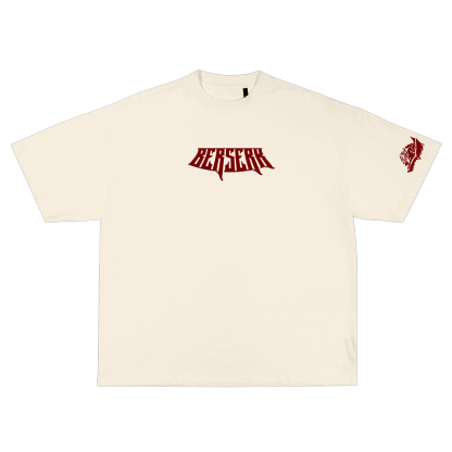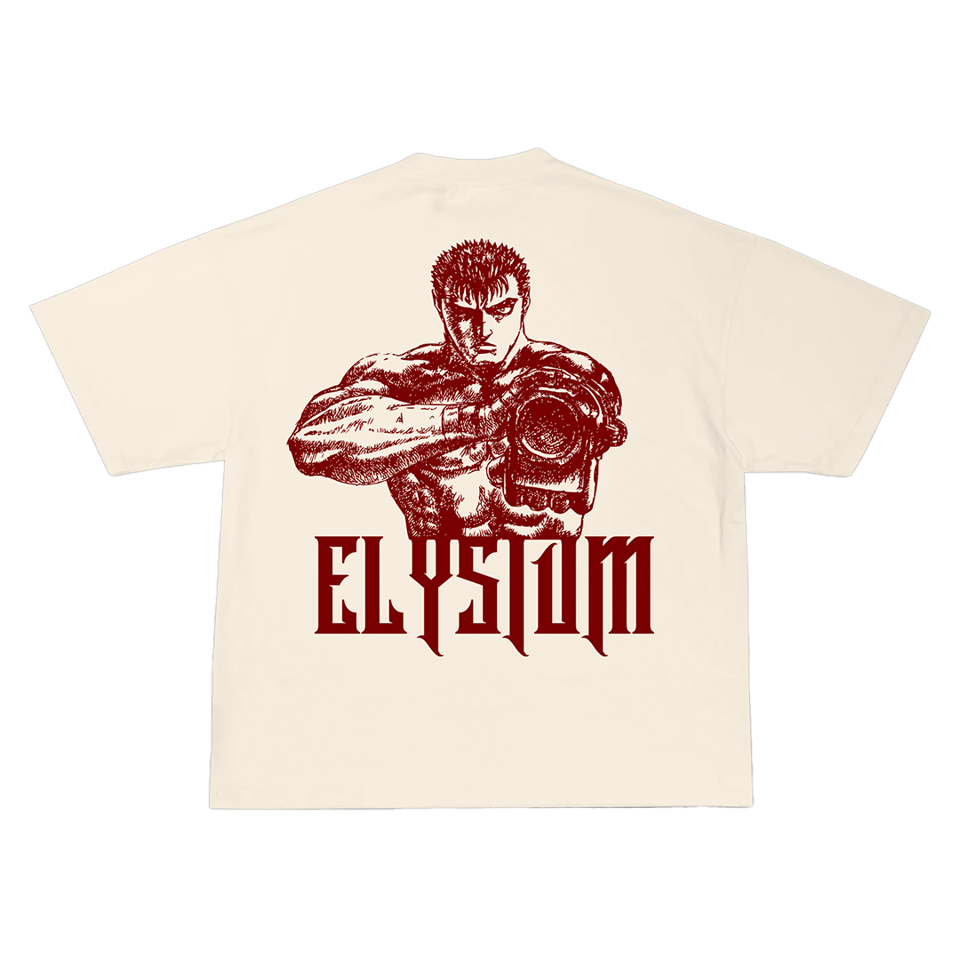 GUTS is an off white garment-dyed tee with original graphic art inspired by Kentaro Miura's Berserk.