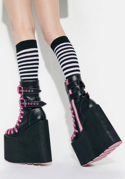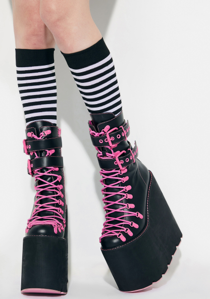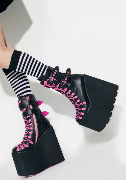 Hot Double Stacked Traitor Boots cuz once you do a double-cross, you gotta be ready to fight! These gnarly platform boots feature a sleek black vegan leather construction, ultra high double stacked wedge heel and platform with cutout tread, contrast lace up closures, pink hardware, wrapped calf straps with adjustable buckles, and side zip closures.