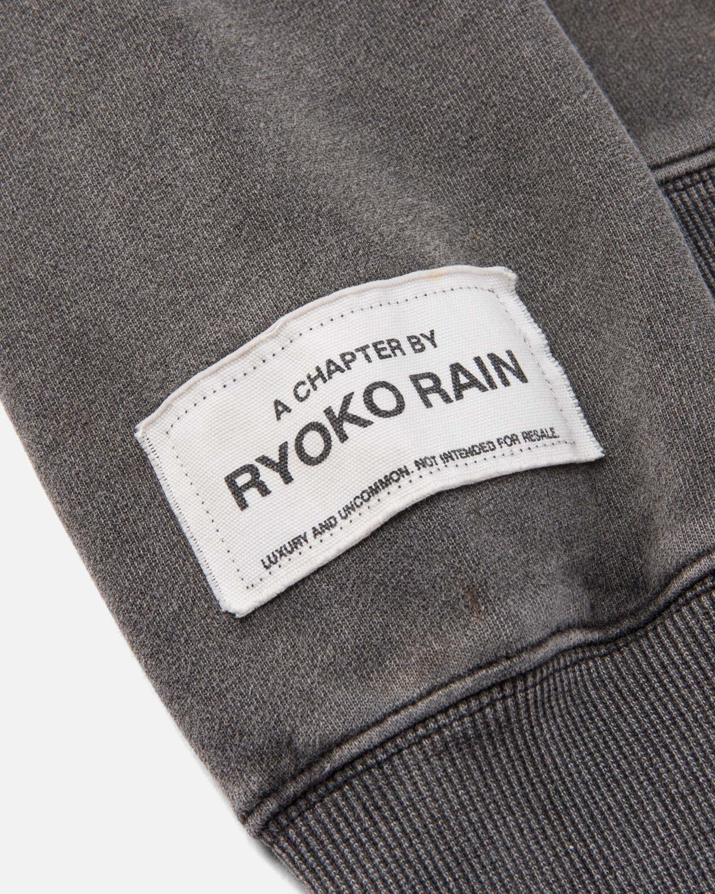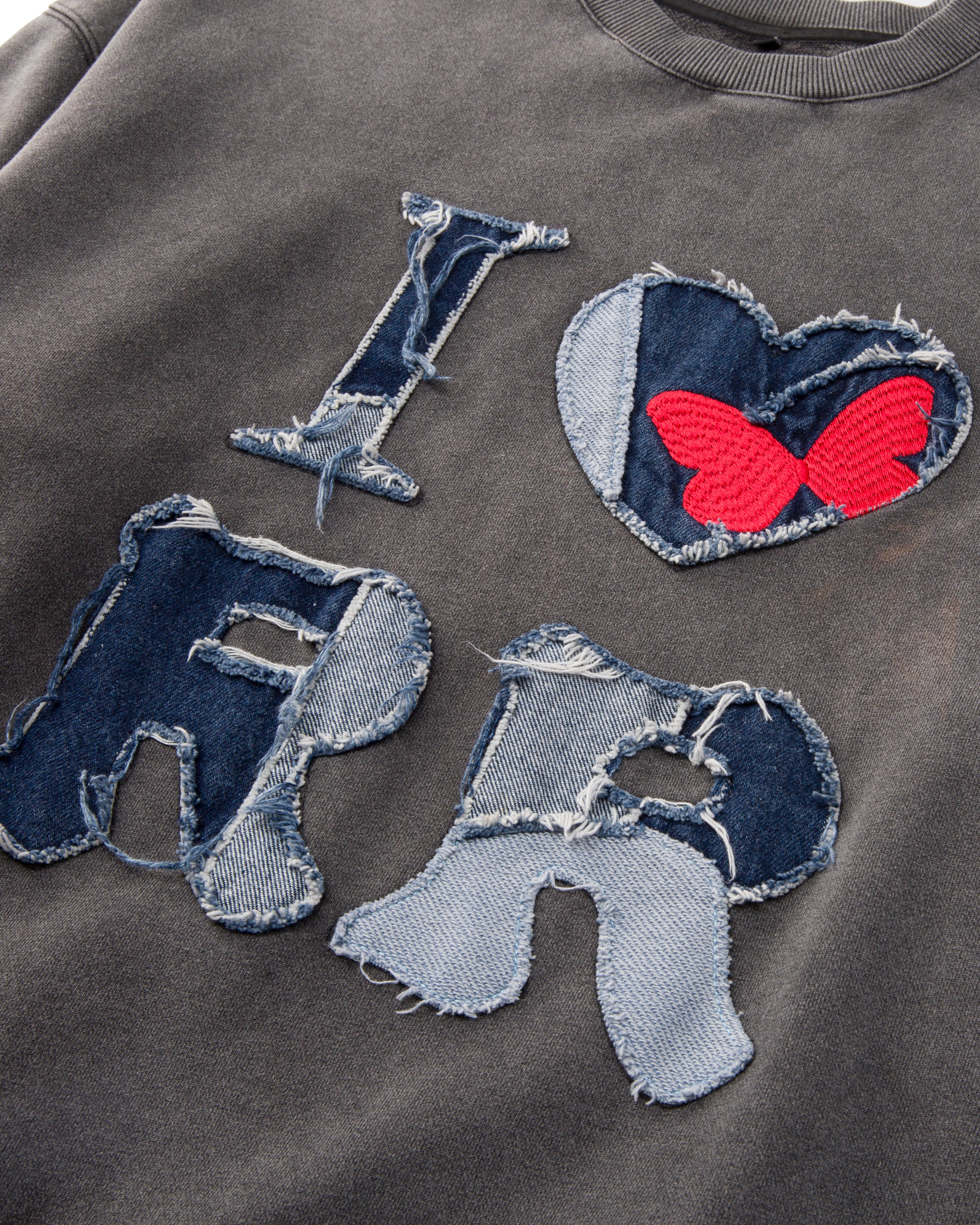 Charcoal garment dyed and washed to give a classic look. Center sewn distressed denim "I HEART RR" patches with red butterfly accent, right lower arm woven patch, as well as ribbed cuffs & band.