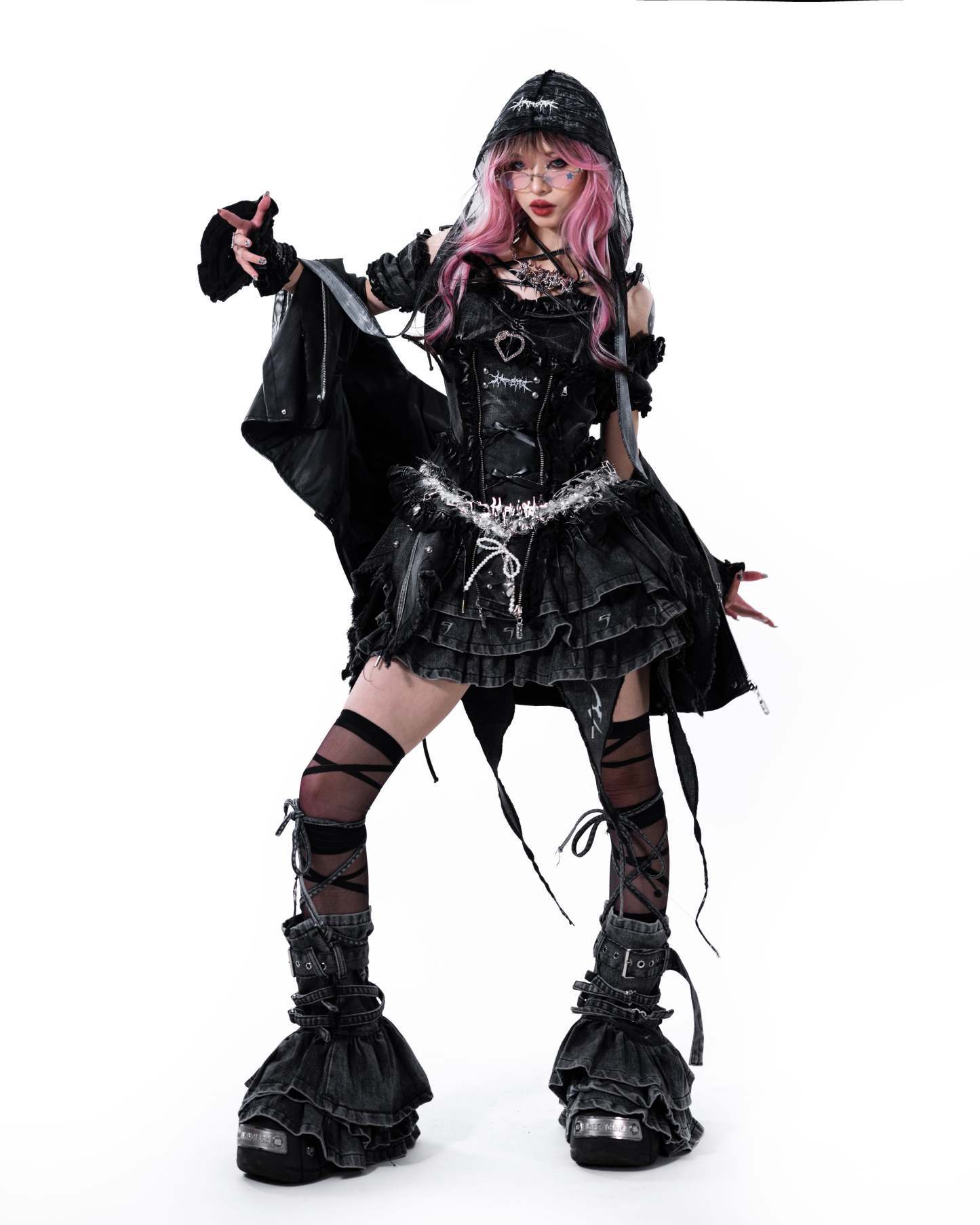 This piece infuses dark punk elements and aesthetics with black denim materials that undergo heavy wash processes, exuding elegance and individuality.