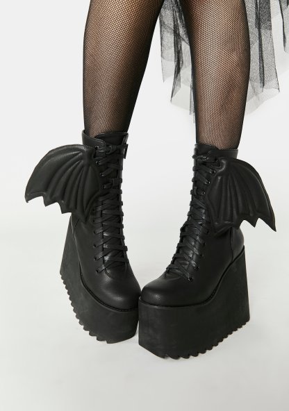 Lil Batty Traitor Boots cuz once ya do a double-cross, ya gotta be ready to fight! These platform boots feature a vegan leather construction, 3d bat wing embellishments, platform wedge heels, lace up fronts, and side zip closures.