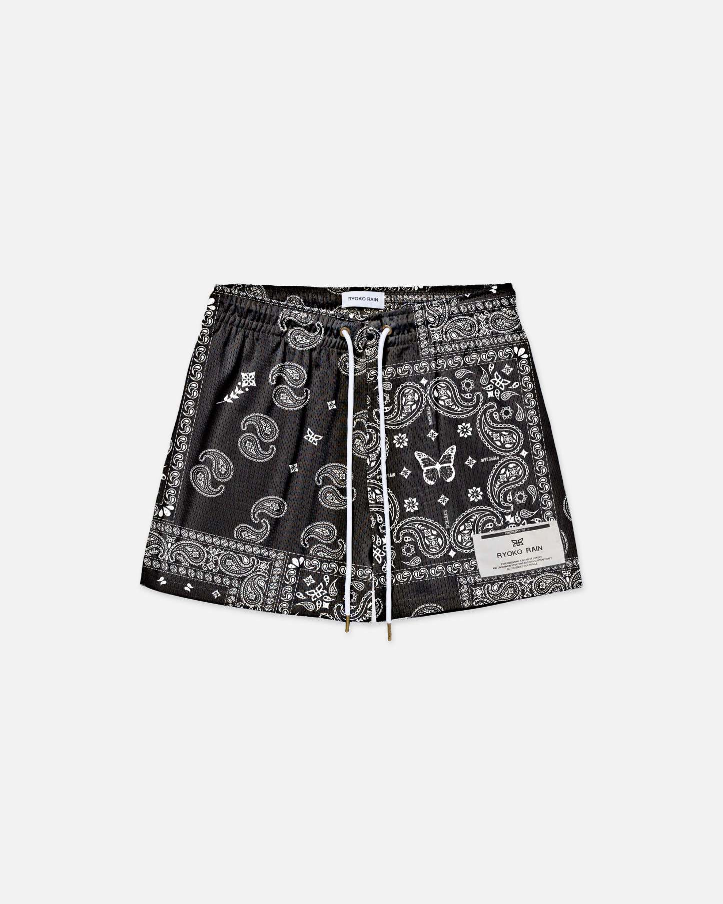 Ryoko Rain black and white original paisley shorts. Deep pockets, elongated draw cord, and above the knee fit. Featuring a left leg woven patch.