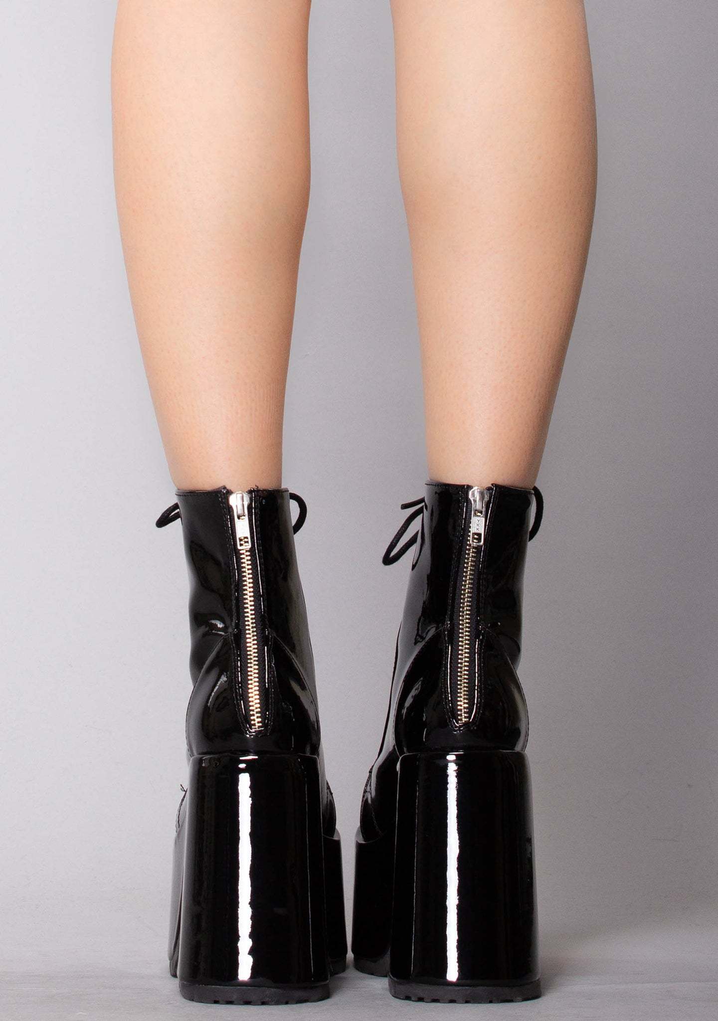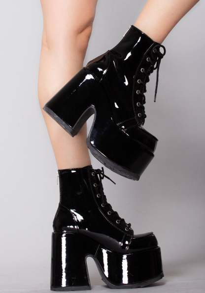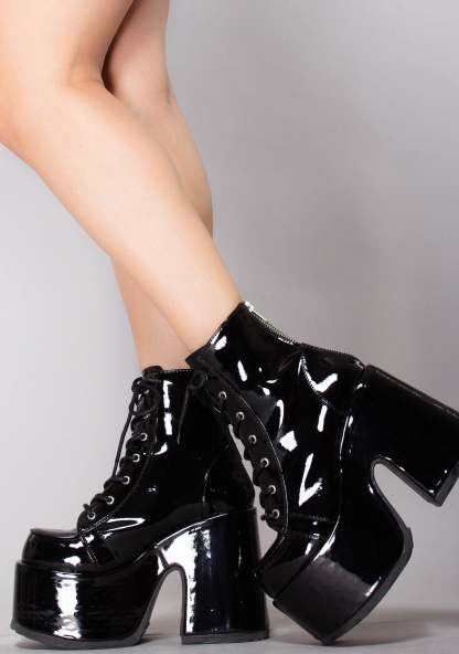 Hell Platform Boots. These wicked rave boots feature a sinful black patent faux leather construction, devious 5” chunky platform heel, rounded toe design, treaded sole arresting silver metal hardware and tonal lace-up closure. ‘Cuz you always heat things up.