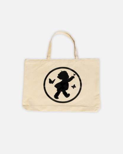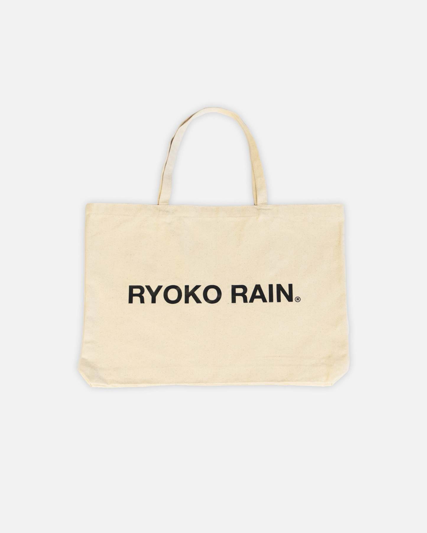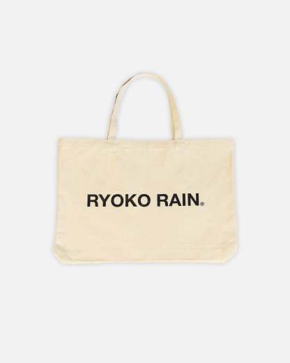Ryoko Rain cream canvas tote bag with black printed poet logo on one side and a black ryoko rain logo on the other. Twin fixed top handles. Imported. READY TO SHIP.