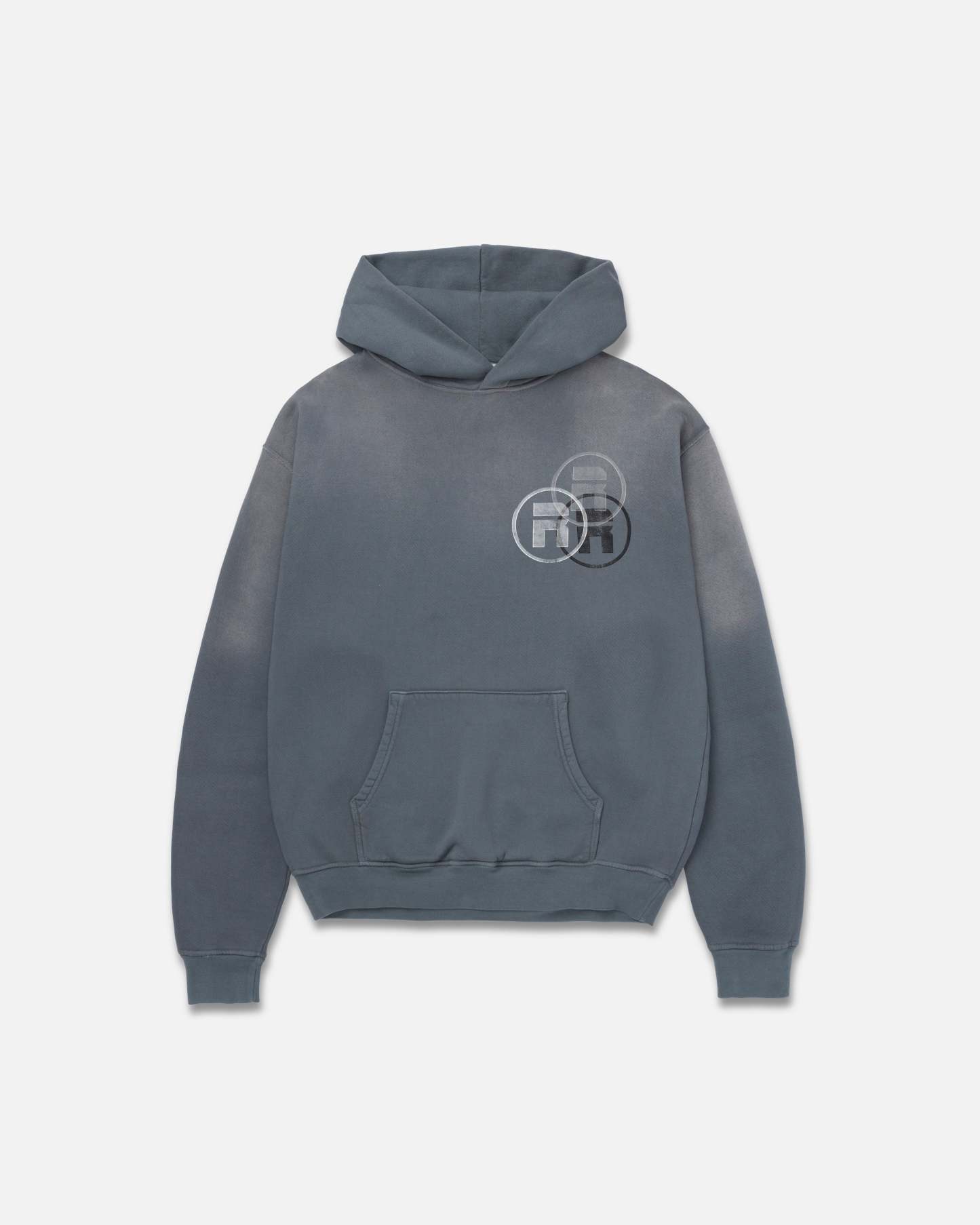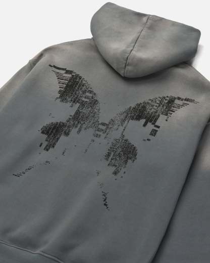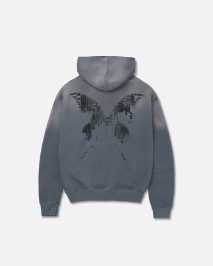 Grey garment-dyed hoodie with a vintage stone washed fade across the hood and shoulders. Left chest tonal distressed Ryoko Rain circle logo and large black distressed butterfly print. Soft micro-ribbing on cuffs and band.