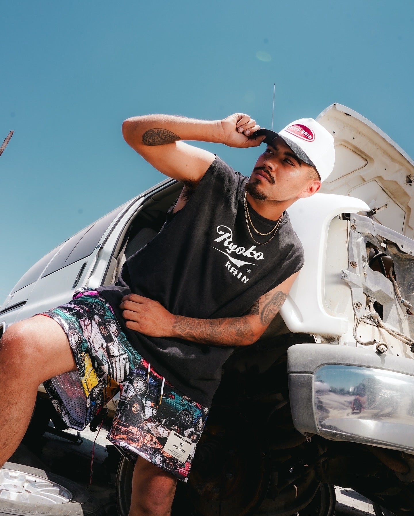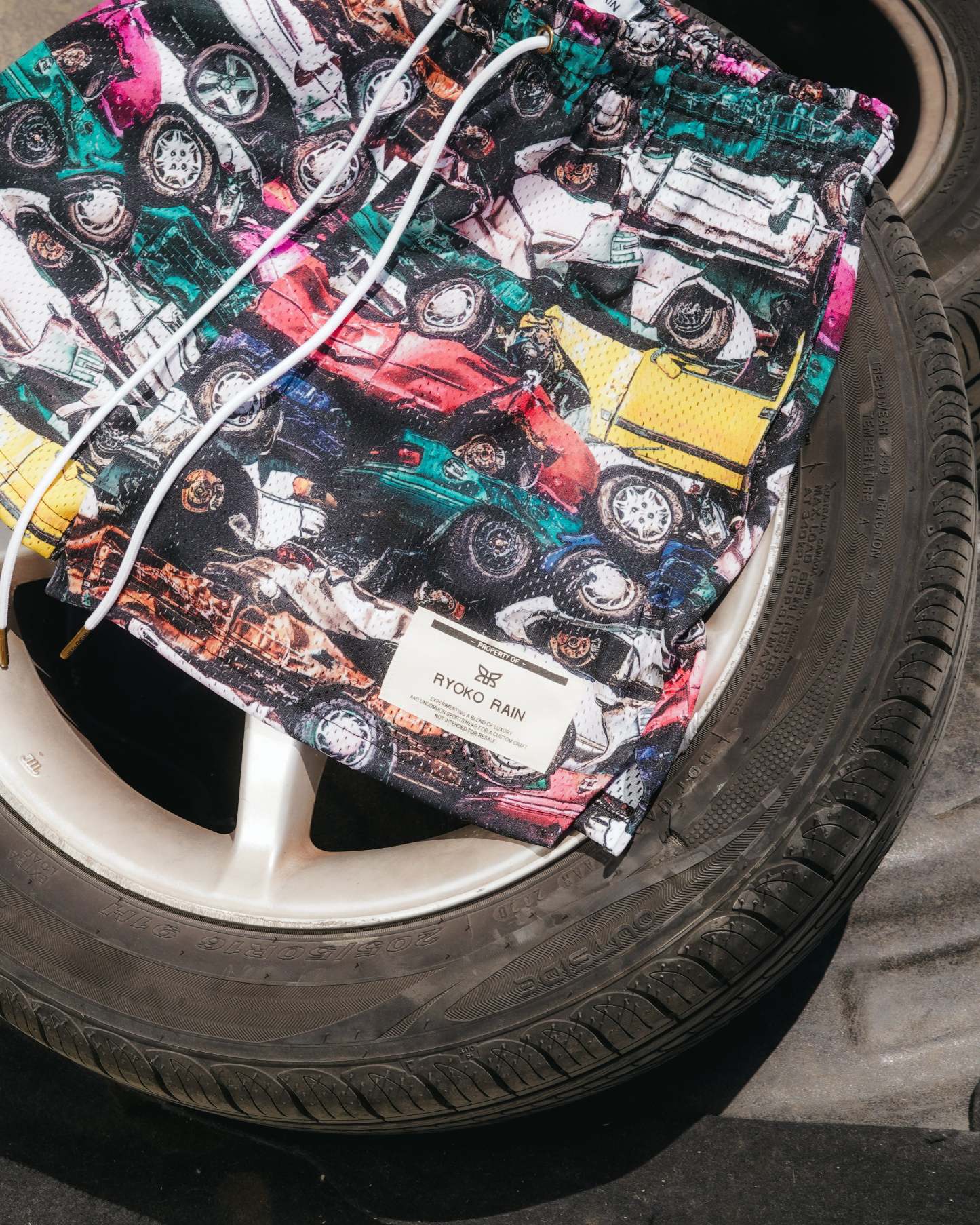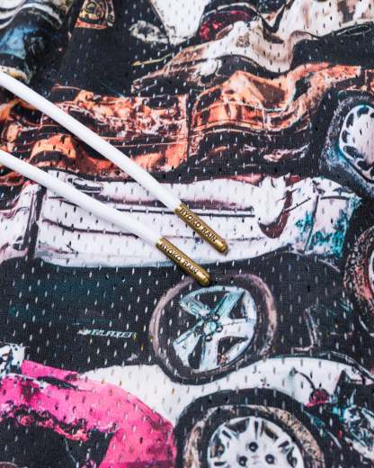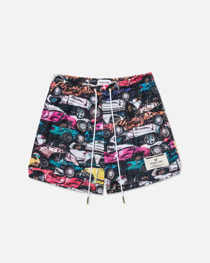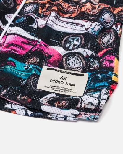 Ryoko Rain mesh shorts with a vintage stacked cars design. Deep pockets, elongated draw cord, and above the knee fit. Featuring a left leg woven patch.