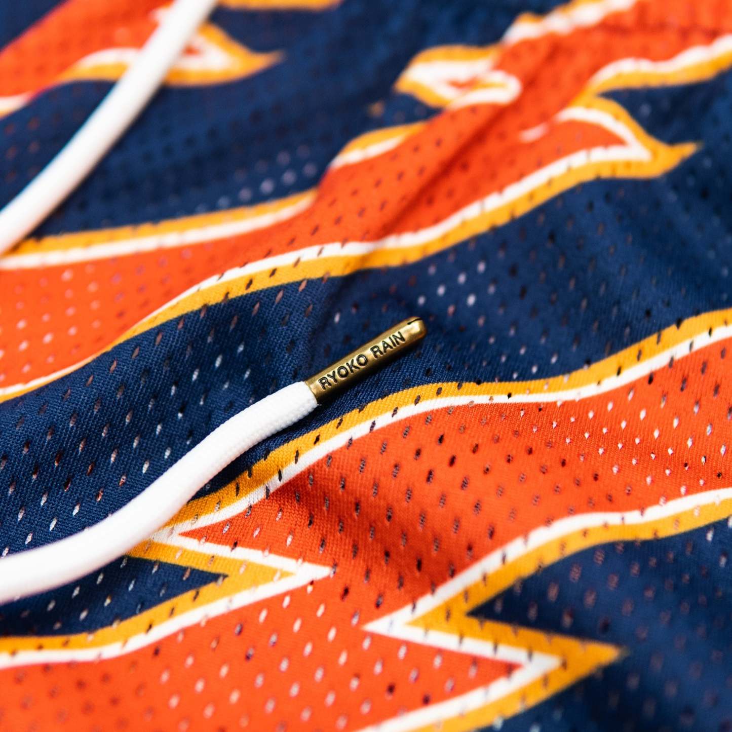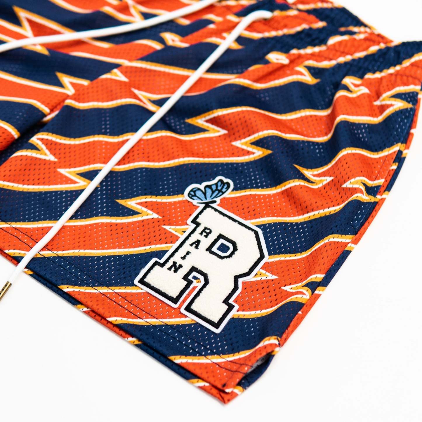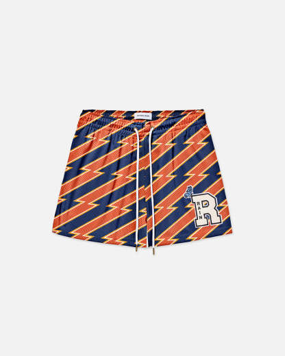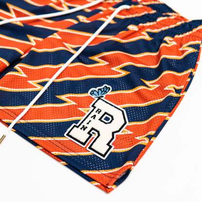 Burnt orange and navy blue lightning bolt striped shorts with original R chenille patch. Deep pockets, elongated draw cord, and above the knee fit.