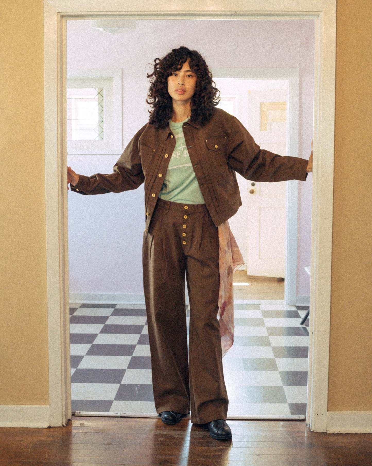 The pants are buggy pants that hold the trend, and the relaxed and wide silhouette offers leg length effects and comfortable comfort. On the other hand, the jacket is a short design and has a balance that makes the upper body look compact. This combination creates an exquisite contrast up and down, giving a stylish impression.